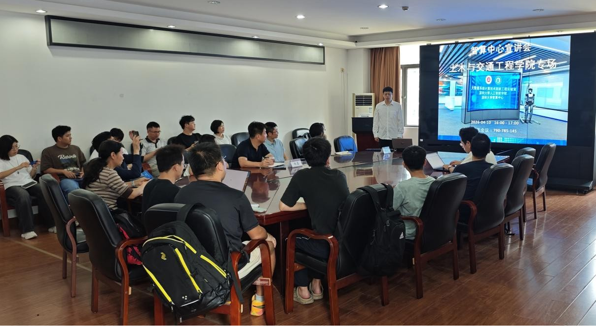 2026年4月10日下午,我院在深圳大学粤海校区(南区)致工楼C501举办深圳大学智算中心宣讲会--土木与交通工程学院专场,主题为“从‘算力焦虑’到‘科研加速’--智算中心如何赋能科研项目”。宣讲会由深圳大学人工智能学院智算中心工程师李果博士主讲、工程师尹邦国参会。包括学院副院长丁志坤教授在内的三十余名教师及科研人员参加了此次宣讲会,学院副院长杨磊教授主持会议。杨磊副院长对人工智能学院专家们的到来表示热烈的欢迎。...