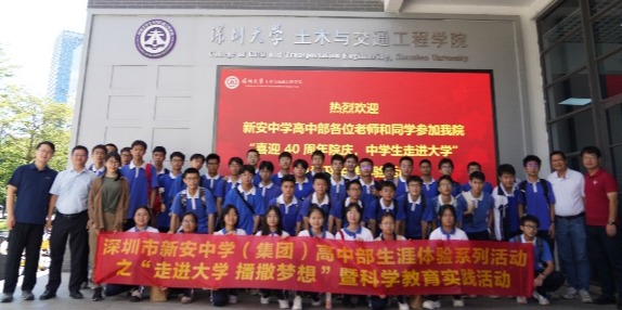 7月9日及11日,在深圳大学招生办和我院的组织下,深圳市新安中学(集团)高中部100余名师生、广东省肇庆市第一中学高一级摘星班的80余名师生来到我校进行参观交流。活动内容丰富多彩,包括校园宣讲、名师讲座、优秀学生分享互动、实验室参观及体验、生涯人物访谈等一系列丰富的活动。两所中学分别是广东省国家级示范性普通高中、广东省一级学校、广东省德育示范学校、广东省中小学心理健康教育特色学校、广东省高中教学水平评估...