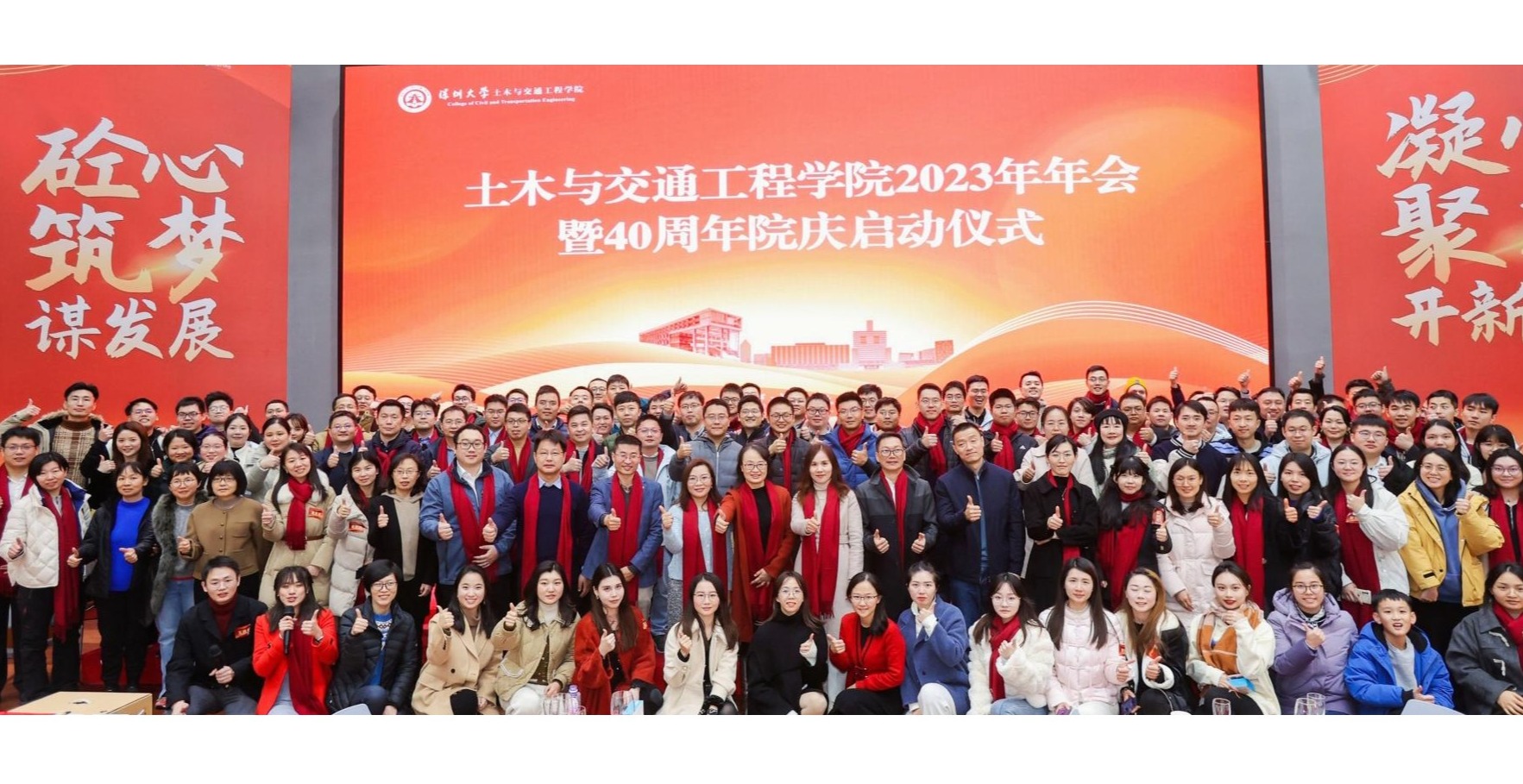 为总结成绩,擘画蓝图,2024年1月23日下午,深圳大学土木与交通工程学院在深圳大学粤海校区校友广场多功能厅举办2023年年会暨40周年院庆启动仪式,本次年会主题为“砼心筑梦谋发展,凝心聚力开新篇”。深圳大学副校长李永华,中国工程院院士、土木与交通工程学院院长陈湘生,中国工程院院士杜彦良、土木与交通工程学院党委书记左英姿、执行院长龙武剑、副院长邹亮、党委副书记陈碧霞、副院长杨磊、副院长包小华、副院长郭峻、副...