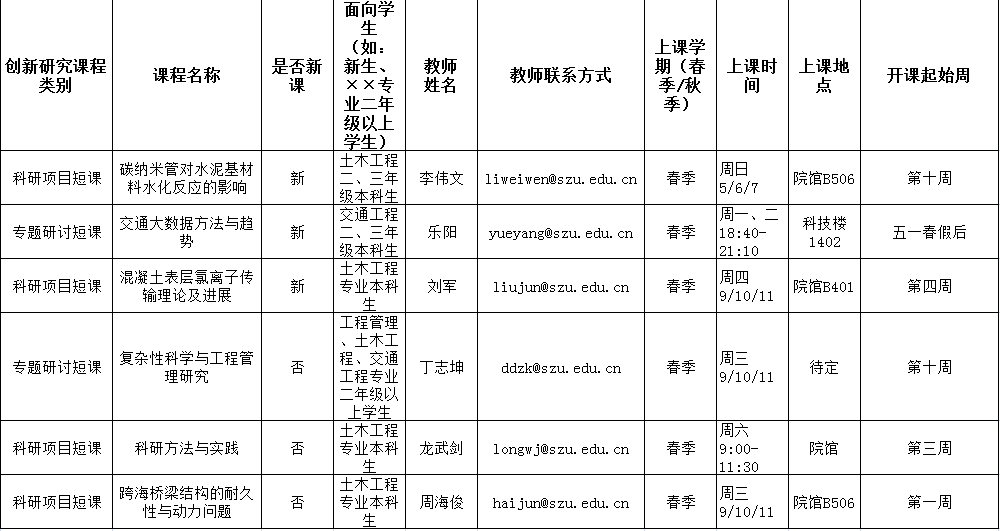 6. 为便于学生与选课系统中课程协调,短课的上课时间与地点一并公布,请同学们留意,表中时间、地点不明确的请同学们咨询开课教师。