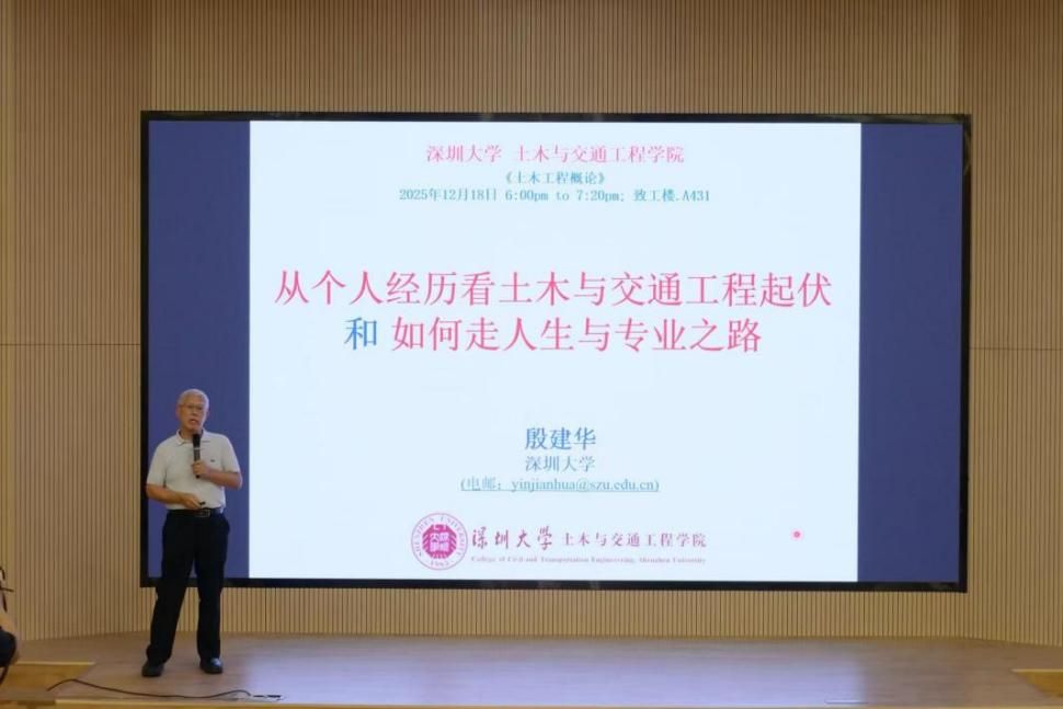 2025年12月18日晚,《土木工程概论》(第五讲)专题讲座在致工楼A431报告厅举行。本次讲座由学院新引进的国家级人才、香港工程院院士、岩土工程领域专家殷建华教授主讲,主题为“从个人经历看土木与交通工程起伏和如何走人生与专业之路”。讲座由学院刘凯教授主持,青年教师代表及2025级全体本科生共同参会聆听。