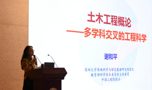 “土木工程——多学科交叉的工程科学”首先讲述了土木工程的概念,谢和平院士结合中外历史上的定义指出土木工程是“利用伟大自然资源为人类造福的艺术”;以土木工程重要核心理论的创建、关键试验手段的发明、和重要工程案例的分析为例,讲述了土木工程跟随人类文明发展脚步、不断与力学、材料、环境、人工智能等各学科融合而发展的历史;通过著名科学家钱伟长的事例,他提到“我没有专业,祖国的需要就是我的专业”,引起与会教师和学生的思想和心灵的震撼;最后总结了古代、近代、现代土木工程发展,结合先进设计案例为同学们展示了未来土木工程的发展。