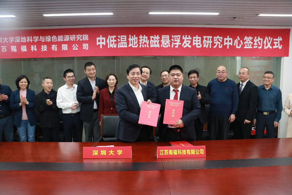 2020年1月9日下午,深圳大学深地科学与绿色能源研究院和江苏赐福科技有限公司合作签约仪式暨“中低温地热磁悬浮发电”研究中心成立仪式在深圳大学粤海校区顺利举行。深圳大学副校长徐晨,深圳大学深地科学与绿色能源研究院院长谢和平院士,江苏省盐城市盐都区委组织部副部长曹阳,江苏赐福科技有限公司董事长翟军、总经理马举昌等出席签约仪式。双方就科技创新推动粤港澳大湾区地热能开发达成共识,谢和平院士和翟军董事长签署了“中低温地热发电磁悬浮发电原理技术和装备”与“月基磁悬浮发电系统技术与装备”等科技合作协议,江苏赐福科技有限公司将专门投入1500万科研经费用于相关研究。