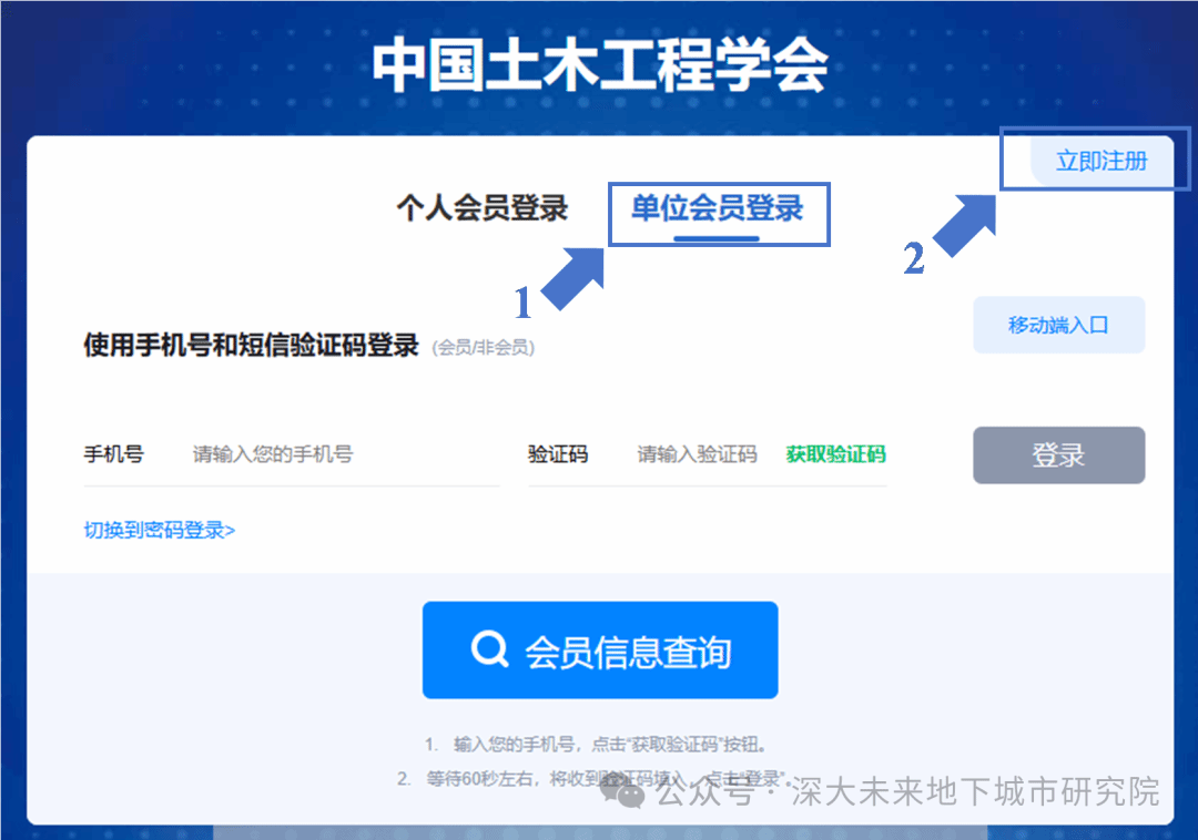 2、点击“单位会员登录”/“个人会员登录”选项后,再点击右上角“立即注册”选项,进入单位会员/个人会员入会须知。