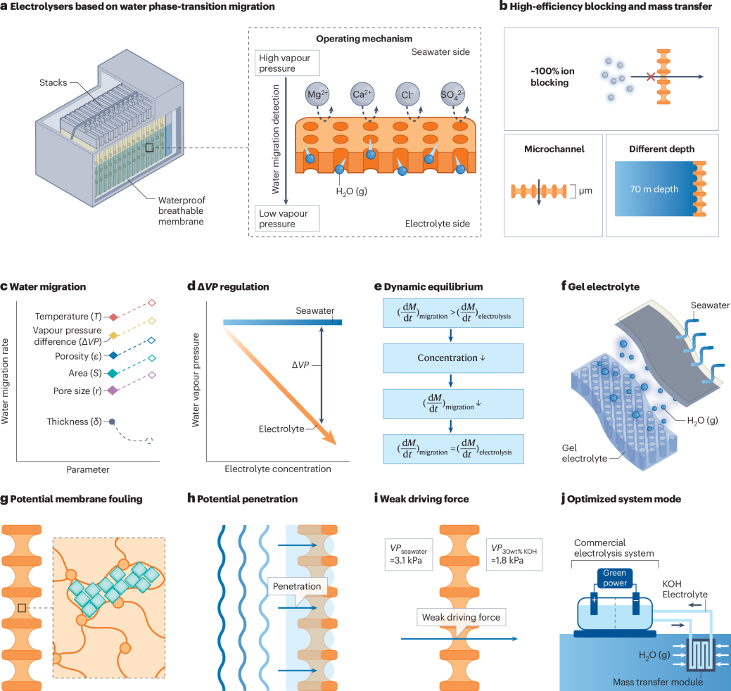 针对上述技术发展核心痛点,本研究系统梳理了海水直接电解过程的关键微观机制,明确了复杂离子环境下析氧/析氯竞争反应、钙镁离子沉积、界面传质变化等对海水直接电解制氢系统的稳定性与能量效率影响作用机制;并结合国际主流技术路线,系统分析了不同方案的工程放大适用性与局限性,首次建立了微观反应机制与宏观系统运行之间的关联认知准则,填补了领域内微观基础与工程应用脱节的研究空白。其中,谢和平院士团队原创的相变迁移海水直接制氢路径(Nature, 2022, 612, 673-678;2022年度科技部“中国科学十大进展”),通过界面压差驱动海水自发“液-气-液”相变传质,从原理上彻底避免了海水复杂组分对电解系统的毒性和腐蚀性难题,实现了无额外能耗下将海水等同于纯水直接电解制氢,在真实海水工况下展现出极强的长周期稳定运行潜力,成为本文提出的系统评估框架的实践案例验证。