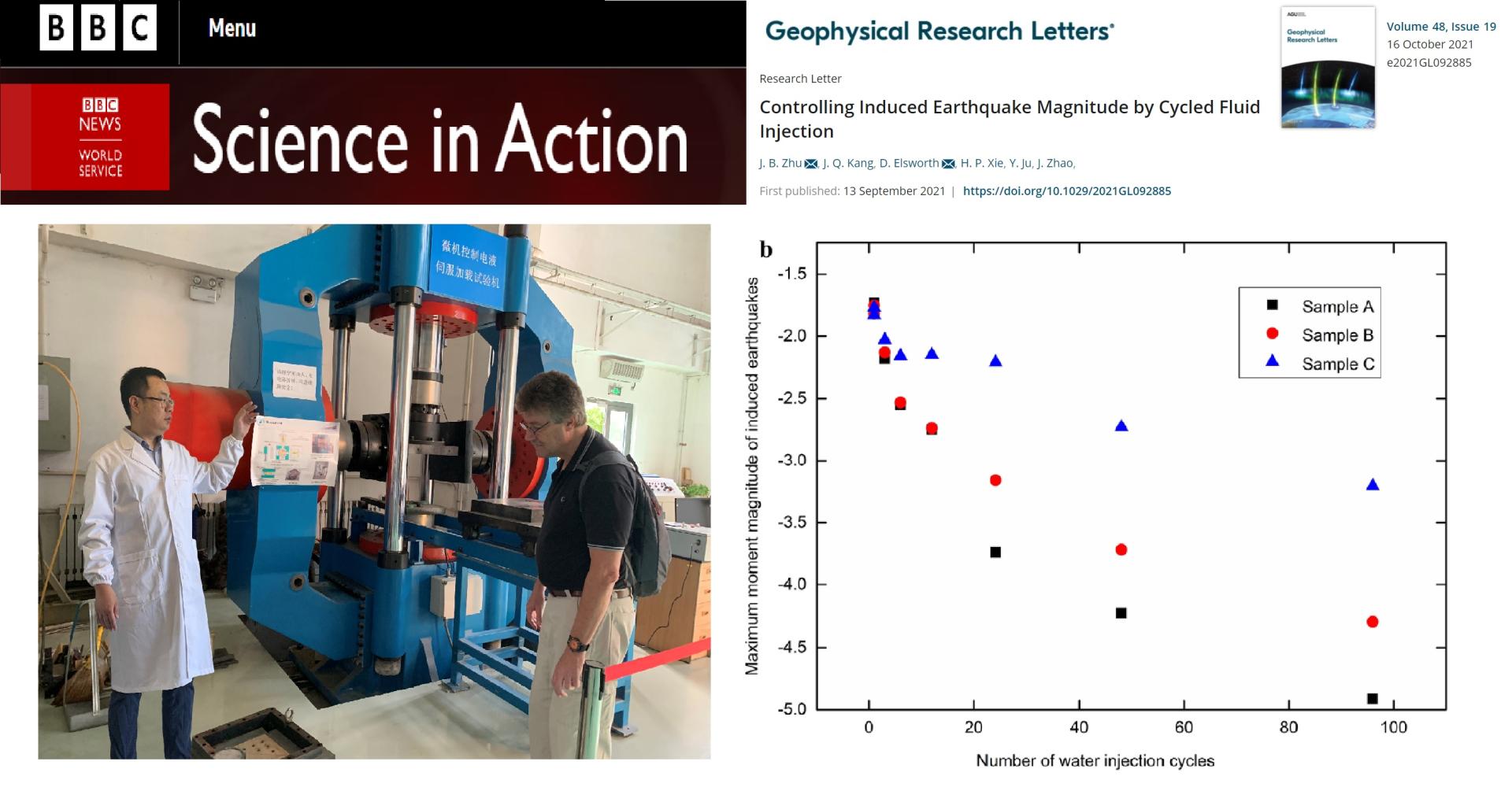 近年来,油气开采、深部地热能开发、深部采矿等工程扰动诱发地震引起国内外普遍关注,成为国际前沿研究热点。在珠江人才计划创新创业团队项目“工程扰动岩石动力学理论与技术”等支持下,谢和平院士团队基于自主研发的疲劳变频注水扰动诱发地震试验系统,开展了注水扰动诱发断层失稳滑动研究。BBC节目Science in Action于2021年9月23日用八分钟时间报道了相关最新研究成果。
