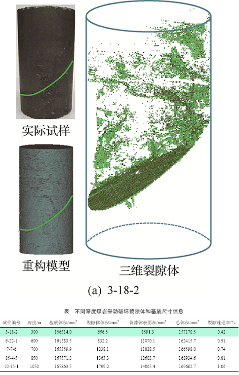 ▲不同深度煤岩采动破坏后的重构模型、裂隙体与实际试件对比图