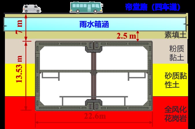 为了破解难题,由中国工程院院士、深圳大学土木与交通工程学院院长陈湘生担任团队负责人,深圳市地铁集团联合深圳大学、中铁装备和中国电建等单位组建科研团队,开展了广东省重点领域研发计划“现代工程技术”重点专项《繁华城区地铁暗挖车站关键技术》项目研究工作,深圳地铁12号线二期工程沙三站为该项目的示范性应用工程。沙三站位于帝堂路与沙井路交叉路口,为地下二层岛式车站,车站总长208.4米,标准段宽22.7米,有效站台宽13米。车站地处城市繁华城区,周边建筑物多,地下水充沛,地质条件复杂,且站址有一处埋深4.2米的新建暗涵。项目科研团队攻坚克难,针对沙三站研制了新型暗挖施工装备——世界上开挖面积最大(宽11.29米、高13.55米)的矩形顶管机“大禹掘进号”。装备由两台设备上下组合而成,采用多刀盘多螺机协同工作的姿态控制技术,实现了超高掌子面水土压力平衡和左右两次零间隙施工装备技术的重大突破。