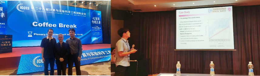 ICCES 2023还安排了多位杰出学者的主题演讲,包括中国科学院程耿东院士、郑晓静院士、郭万林院士,美国医学与生物工程院院士、欧洲科学与艺术院院士、乌克兰国家工程院外籍院士潘毅教授,Marco Amabili教授、M. Jamal Deen教授、段慧玲教授和庄茁教授等。值得注意的是,深圳大学胡明伟教授在本届会议上首次创办了智能交通系统(S43:Intelligent Transportation Systems)分论坛,将智能交通系统仿真与计算实验科学工程交叉,引发积极反响,收录多篇投稿,共有5位学者参与线下学术汇报交流,其中包括深圳大学土木与交通工程学院在读博士生阮大为在分论坛上做了Simulation and Evaluation of Passenger Flow Control in Urban Rail Transit Stations Based on System Dynamics汇报。