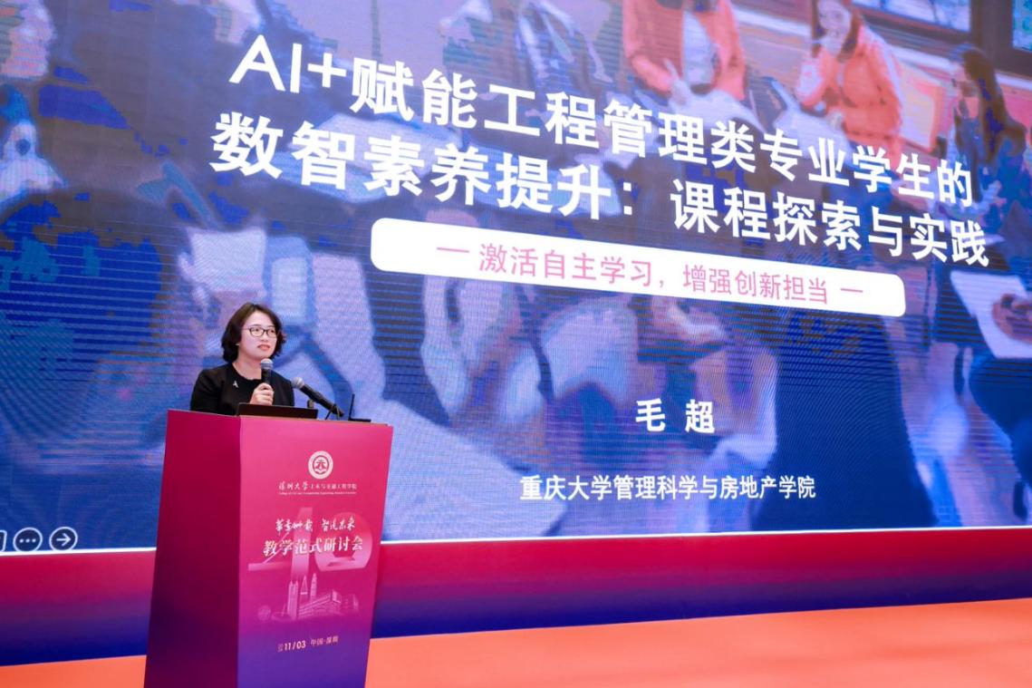 重庆大学管理科学与房地产学院书记毛超作《AI+赋能工程管理类专业学生的数智素养提升:课程探索与创新实践》报告,指出要以学生的自驱力作为培养的目标,充分考虑数字化、智能化、智慧化的融入,构建全过程、全覆盖、全场景的人工智能通识课程体系,去提高学生的素质素养。