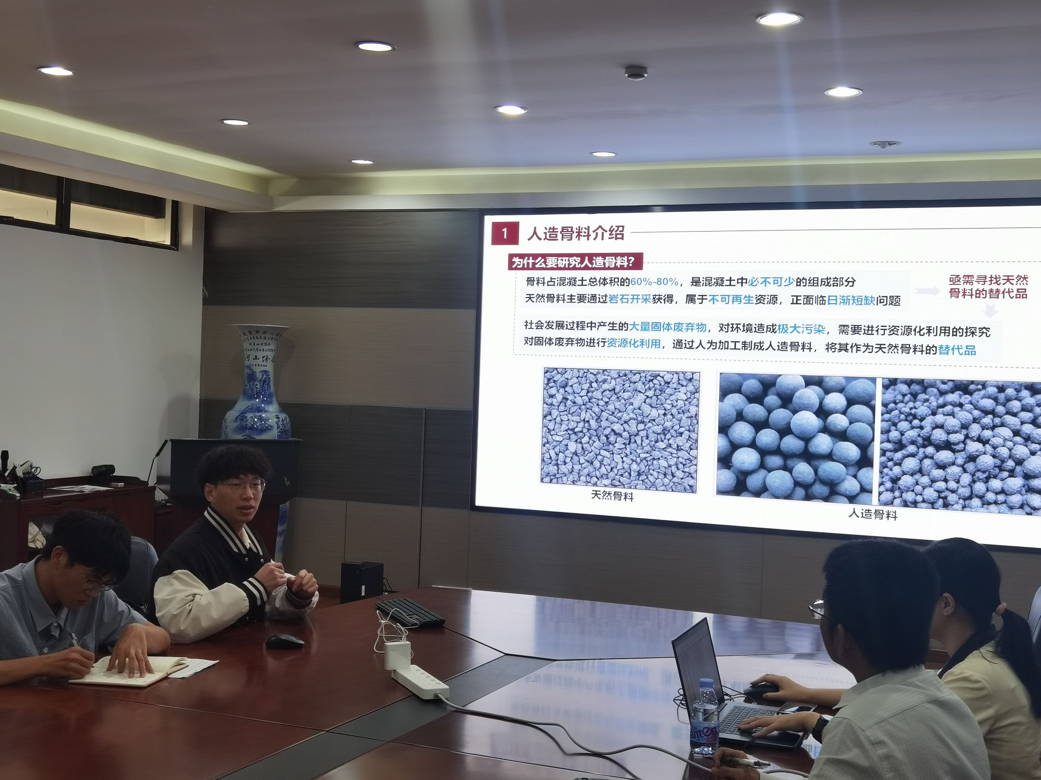 作为本次大会的特色环节,“研”途“砼”伴学术分享紧扣研究生实际需求,以问题为导向,推动党员同志在科研道路上互帮互助。朱振宇同志以《人造骨料制备方法与单颗粒强度测试方法》为题,通过对比天然骨料与人造骨料的性能差异,深入浅出地剖析了资源循环利用的科研价值与现实意义。与会党员认真聆听,或凝神记录,或即时查阅资料,展现出严谨专注的学术态度。这一分享不仅呼应国家“双碳”战略,更彰显了土木专业党员将论文写在祖国大地上的实践决心。