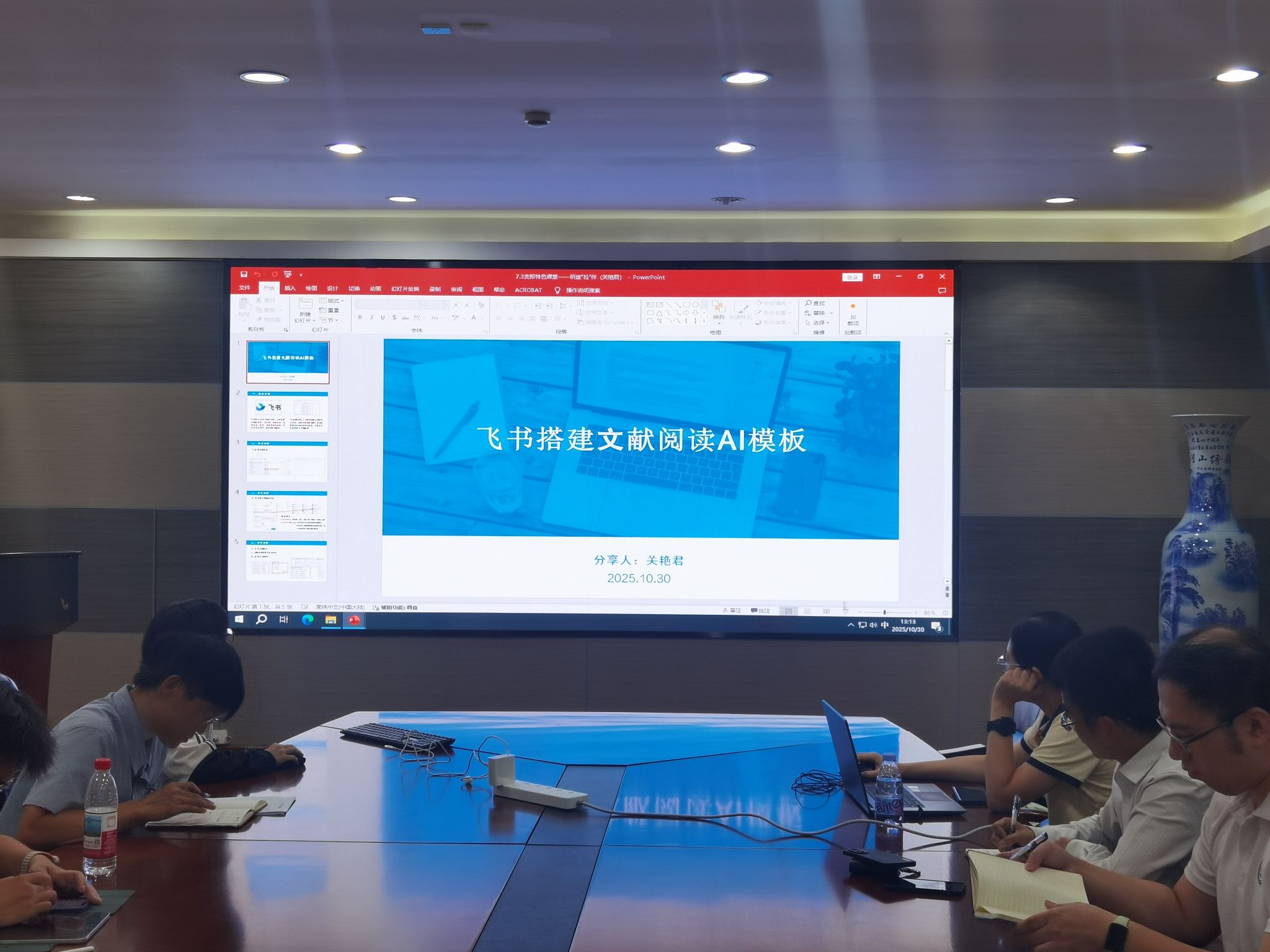 关艳君同志以《飞书搭建文献阅读AI模板》为题,通过实操演示,指导党员利用AI工具高效整合文献资源,提升科研效率。清晰的步骤讲解与党员们专注的学习状态相互映衬,勾勒出一幅“党建+学术”的生动图景——党建工作不仅是思想引领,更是能力提升的助推器。