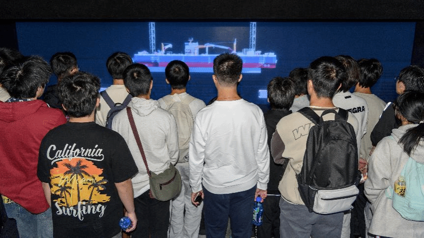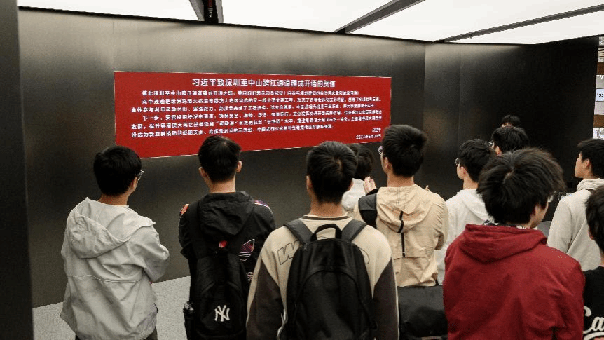 互动体验环节中,AR体验仓让师生们共同“化身飞鸟”近距离领略工程风貌,AI合影技术将每个人的笑脸融入建设者行列,知识互动墙前大家跨支部组队踊跃竞答、热烈探讨。由七彩安全帽拼成的“深中LINK”大字墙前,师生们深刻体会到“精益求精”“攻坚克难”的精神内涵。