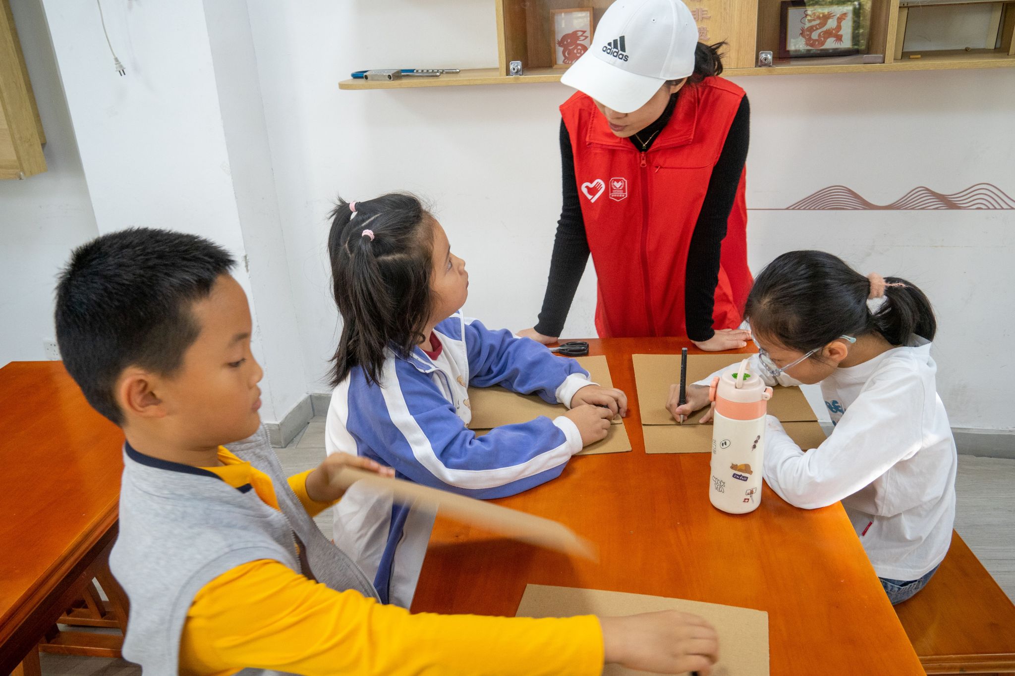 知识讲解环节后,党员志愿者带领小朋友们制作纸板桥梁模型。在顾玉婷的引导和沈庭乐、吕彩茹、陈曦杰、黄媛等同志的悉心协助下,小朋友们分成小组,利用准备好的硬纸板、胶带、剪刀等材料,开动脑筋,亲手搭建属于自己的“桥梁”。志愿者们穿梭于各小组之间,耐心解答疑问,协助解决结构稳固性等“工程难题”,将专业的力学概念以最直观的方式传递给孩子们。活动现场气氛热烈,孩子们兴致盎然,在“建造”过程中不仅锻炼了动手能力与团队协作精神,更对桥梁的结构和承重原理有了切身体会。李嘉豪同志则负责全程摄影记录,捕捉了无数专注制作与成功展示的精彩瞬间。
