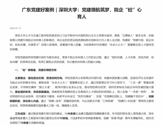 近日,中共广东省委教育工作委员会公布了“党建好案例、书记好党课、党员好榜样”优秀成果入选结果,我院党委申报的《党建领航筑梦,院企“砼”心育人——以党建引领院企协同育人模式的探索与实践》成功入选“党建好案例”。