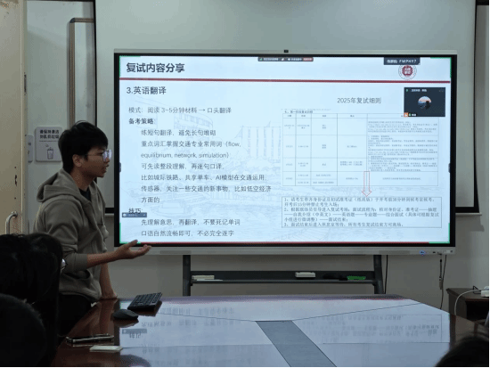 江可彬同学针对复试各环节给出专属备考方法:自我介绍准备中英版本,需烂熟简历中的比赛、论文等细节;专业知识主攻名词解释和个人观点;英语翻译要重点掌握交通专业词汇,练短句口译、流畅表达即可;考官提问多围绕比赛、科研、团队合作展开,需提前准备亮点案例,用专业术语作答并预设提问点;英语口语要抓取主题词,逻辑清晰分点作答,可适当套用模板句式。