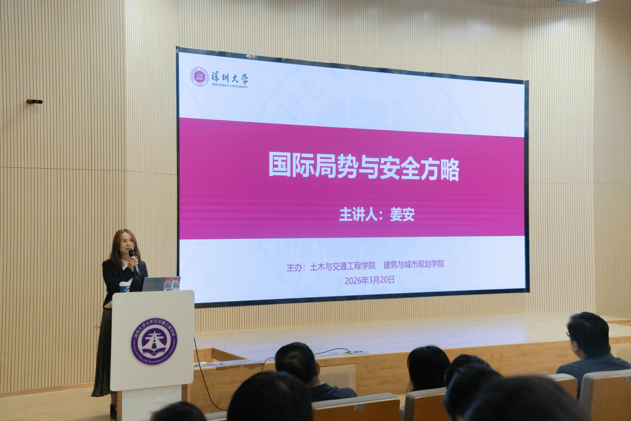 当前,世界百年未有之大变局正在加速演进,复杂多变的国际局势引发每一位师生对世界和平与国家安全的深度关切,为帮助师生认清国际形势、增强国家安全意识、强化责任担当,3月20日,深圳大学土木与交通工程学院、建筑与城市规划学院在致工楼A431报告厅联合主办“国际局势与安全方略”讲座,讲座由马克思主义学院姜安教授担任主讲人,土木与交通工程学院党委书记左英姿主持,近200名师生到场聆听。