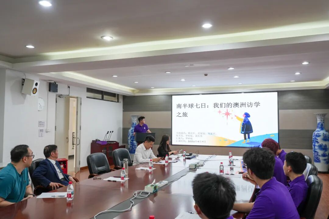 学生代表颜聚龙、袁宇、赵子懿、张嘉俊、欧苑涵、黄婷婷、许嘉蓥依次登台,结合自身访学所见所闻所感,从专业学习、日常生活、交通出行、历史人文及跨国交流等多个视角,分享了此次澳洲之行的满满收获与深刻感悟。