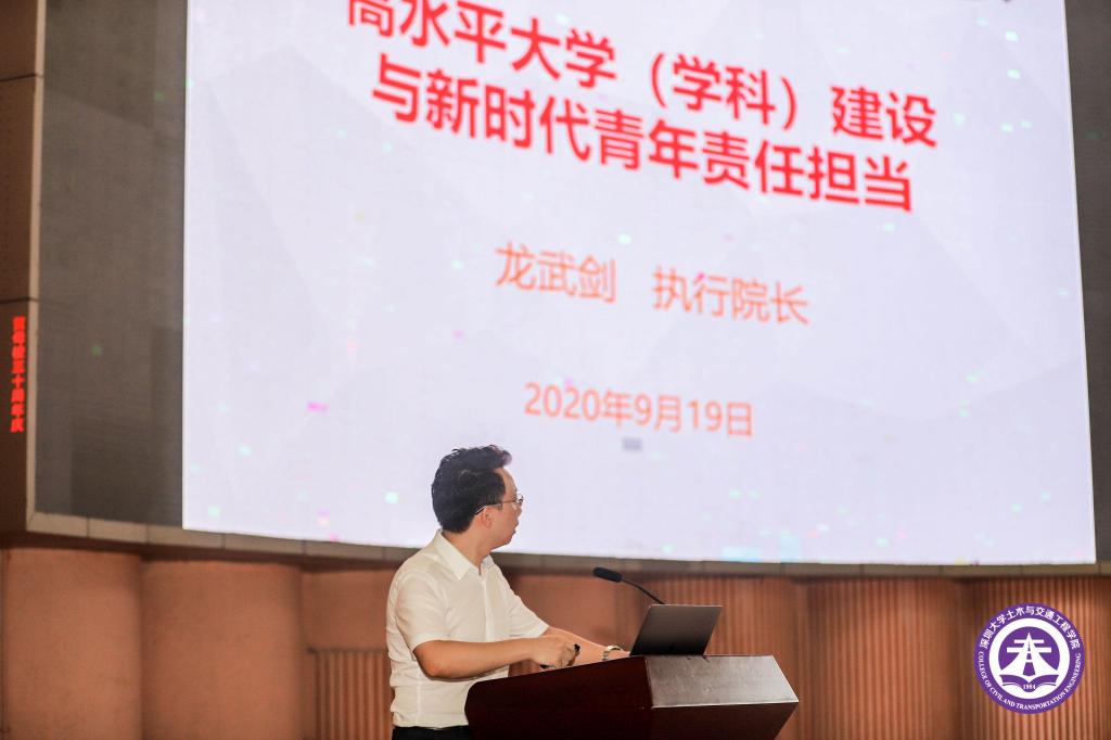 随后,龙武剑院长从完整的本-硕-博培养体系、师资力量、学院机构构成、本科专业及特色班、国际交流、科研项目这六个方面向新生们介绍了深圳大学土木与交通工程学院学科建设的主要情况。希望学院强大的师资力量、先进的科研条件、完善的育人体系,能为新生们快速成长,良好发展奠定基石。最后,龙武剑院长引用习近平总书记给中国石油大学(北京)克拉玛依校区毕业生的回信中的话语勉励新生:“前进的道路从不会一帆风顺,实现中华民族伟大复兴的中国梦需要一代一代青年矢志奋斗”,希望同学们在学习以及未来的职业生涯中做到有责任,有担当,深刻体会并以实际行动践行“夯土筑诚,砺木至臻”的院训精神。