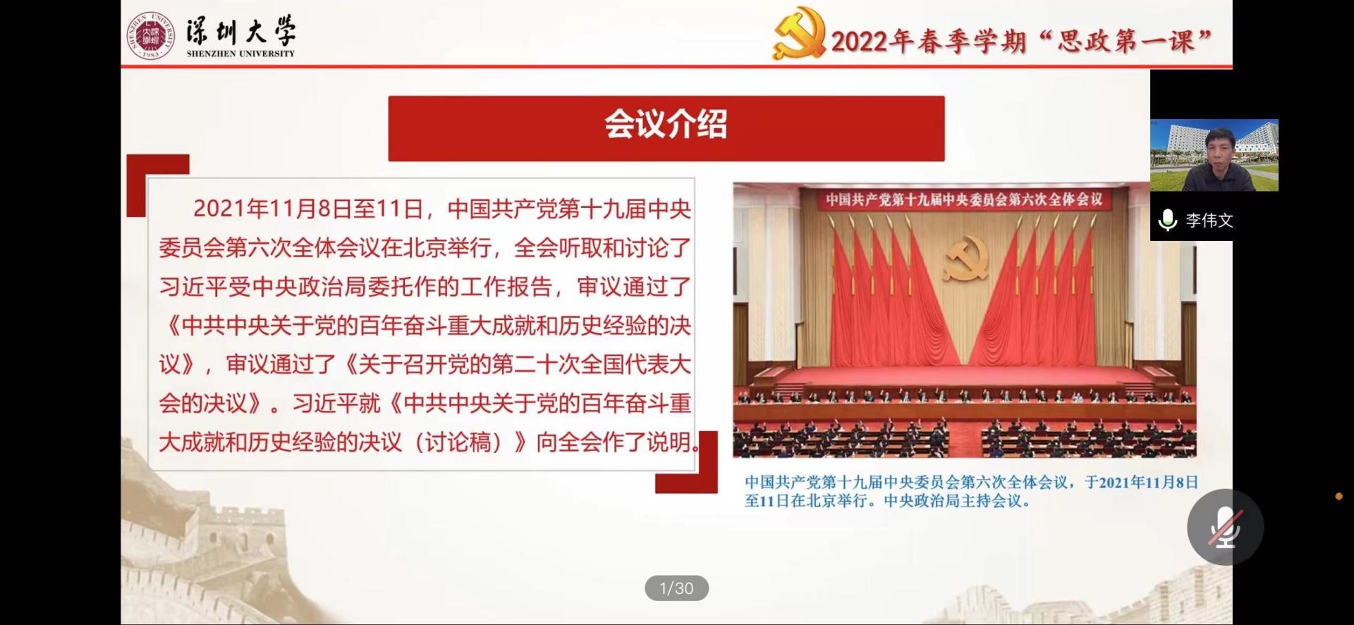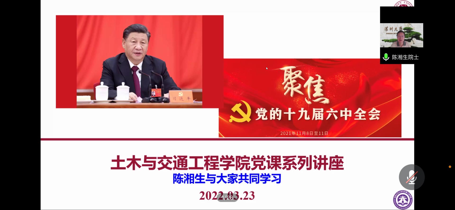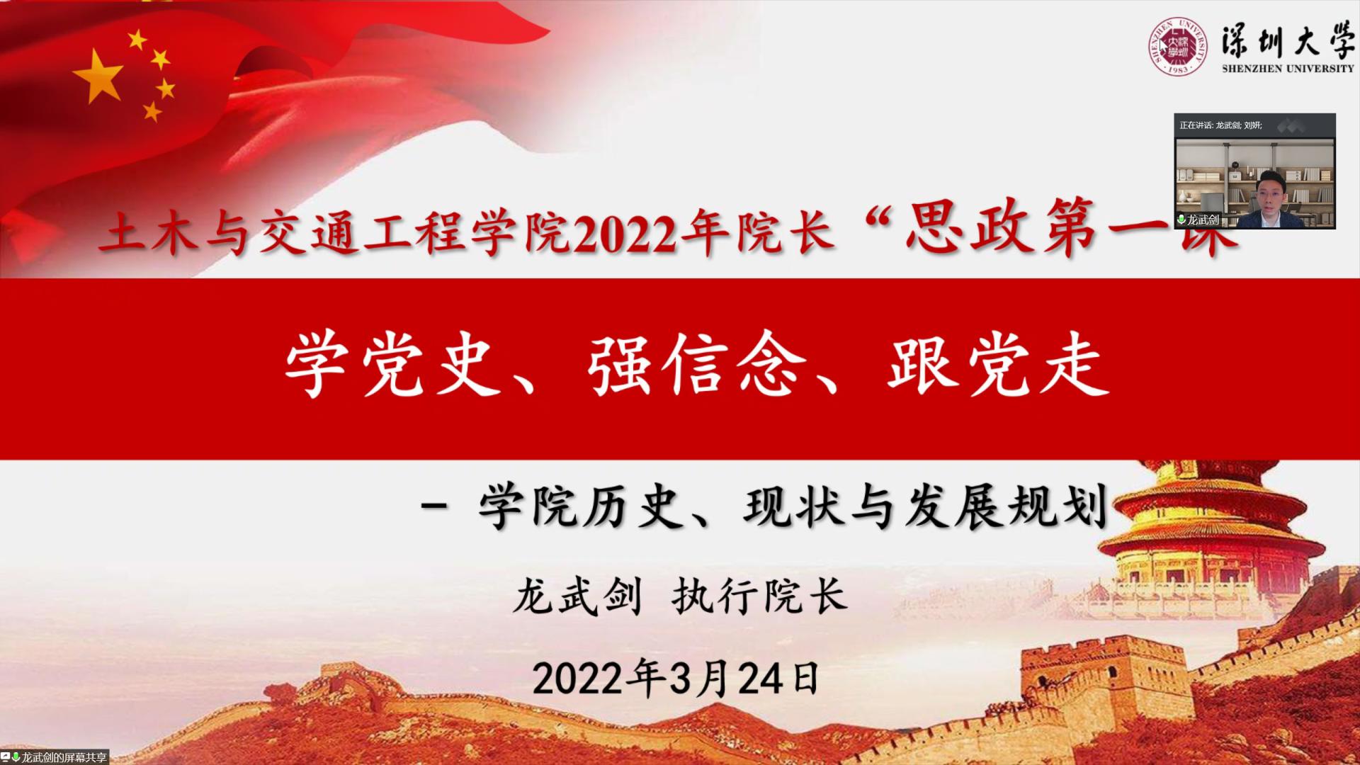 为了深入学习领会党的十九届六中全会精神,教育引导青年学生深刻认识党的百年奋斗重大成就和历史经验的重大意义。土木与交通工程学院2022年春季学期“思政第一课”在腾讯会议深大版线上举行。2022年3月23日下午,由中国工程院院士、深圳大学土木与交通工程学院院长陈湘生和土木与交通工程学院党委书记李伟文主讲,学院2021级220余名本科生参加。2022年3月24日中午,由土木与交通工程学院执行院长龙武剑主讲,学院2021级260余名研究生参加。