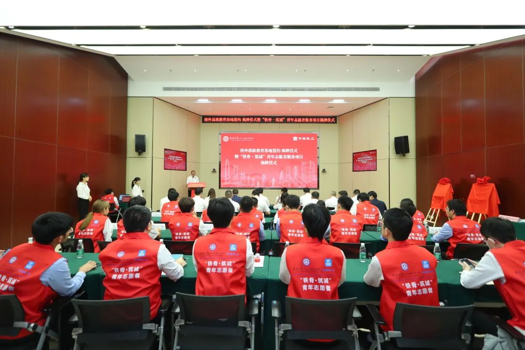 仪式现场,深圳大学土木与交通工程学院与中建科工深圳公司签订合作协议,左英姿与段海、陈碧霞与深圳中国钢结构博物馆执行馆长张利锋代表合作双方分别为校外思政教育基地、“铁骨·筑诚”青年志愿者服务项目揭牌。