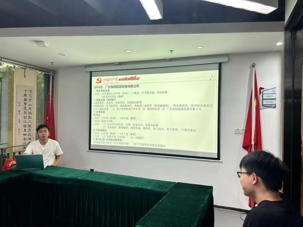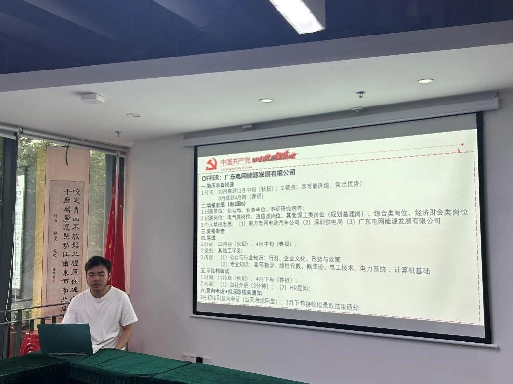 即将赴广东电网工作的吴海华同学分享了广东电网及国家电网的备考经验。他从“志愿填报”、“笔试”和“半结构化面试”三个方面详细介绍了自己的备考过程及相关经验。吴海华同学提醒大家,非科班出身的同学应在平时学习和生活中加强专业知识的学习,并培养对形势与政策的敏感度。