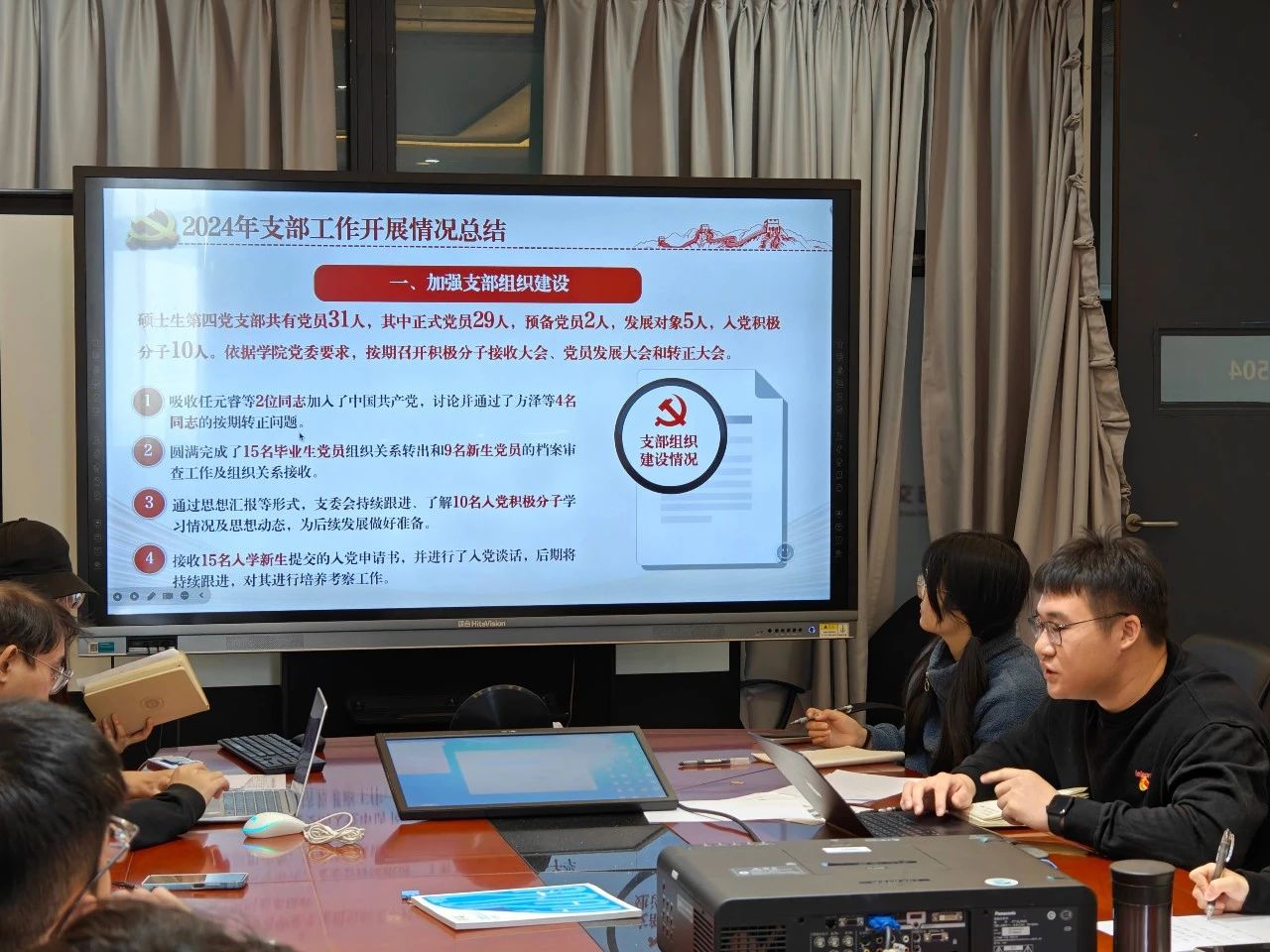 为总结党支部过去一年里经历的重要事件、取得的优异成绩、面临的挑战以及工作中的不足之处,从中吸取经验教训,从而更好的规划支部未来的发展建设,2024年12月19日,硕士生第四党支部在L1-1504召开年度总结大会。
