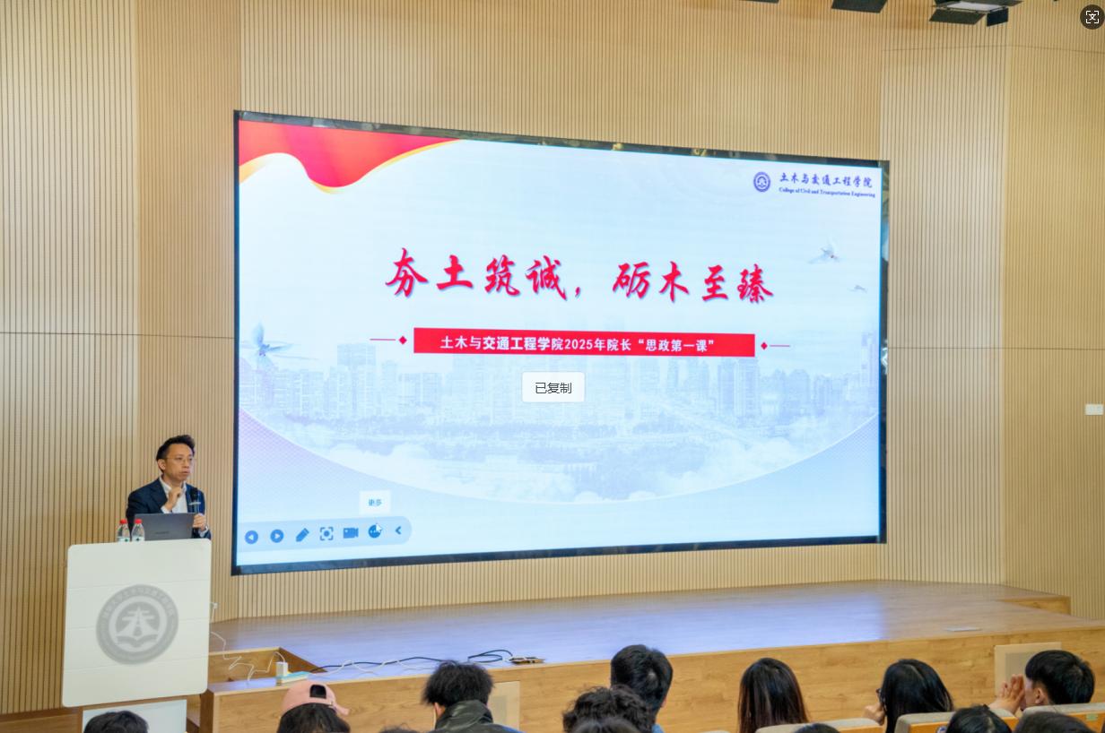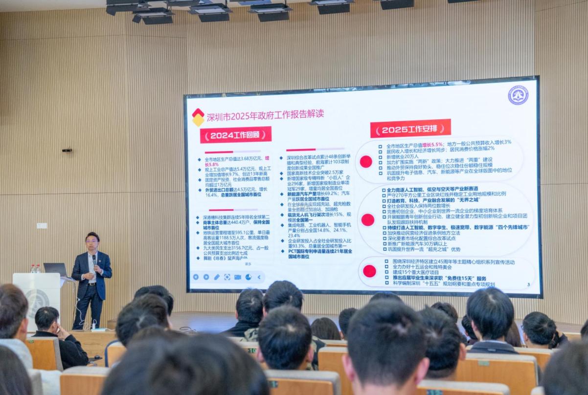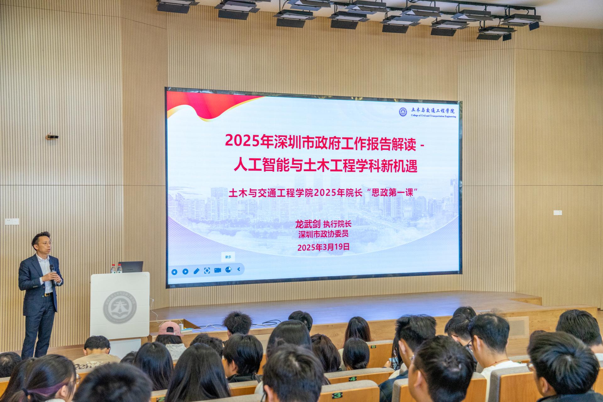2025年3月19日,我院执行院长龙武剑教授以《2025年深圳市政府工作报告解读——人工智能与土木工程学科新机遇》为主题,为2024级研究生讲授了一堂生动的“思政第一课”。课程紧密结合深圳市发展规划与学科前沿,深入探讨人工智能技术赋能土木工程领域的实践路径,为学子们擘画学科发展与城市建设的未来蓝图。