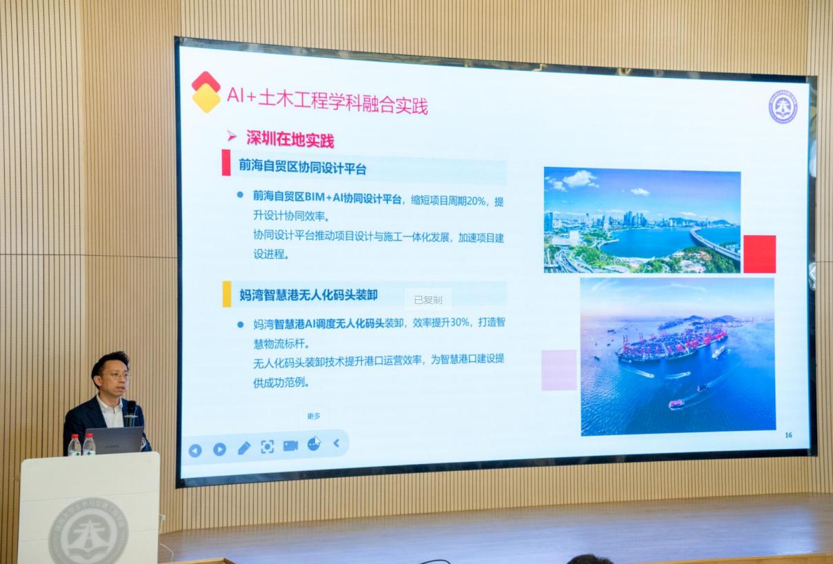 课程重点探讨了人工智能与土木工程的深度融合。龙武剑执行院长指出,传统土木工程存在设计效率低、施工风险高等痛点,而AI技术为行业转型提供了智能化解决方案。他列举了清华大学桥梁健康监测系统、同济大学数字孪生工地等高校案例,以及深圳本地实践——华为智慧工地安全预警、前海自贸区BIM+AI协同设计平台等。此外,深圳大学在AI+土木工程领域已取得多项成果,如智能防灾评估系统、虚实结合的智能养护技术等。龙武剑鼓励学生:“学科交叉是未来趋势,要主动拥抱AI技术,培养自主学习能力,成为推动行业变革的实践者。”