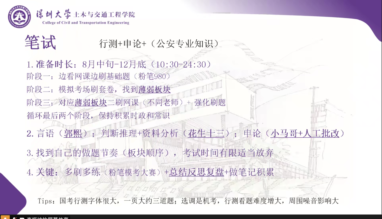 慕容锋带来了公务员考试策略与备考经验分享。他分享了如何获取考试信息,并分析了广东地区热门的考试难度以及选岗策略,如避开强势学科、综合考虑晋升空间和待遇等因素。他的分享让同学们打破了信息差,让同学们对于考公有了更全面和深入的了解。