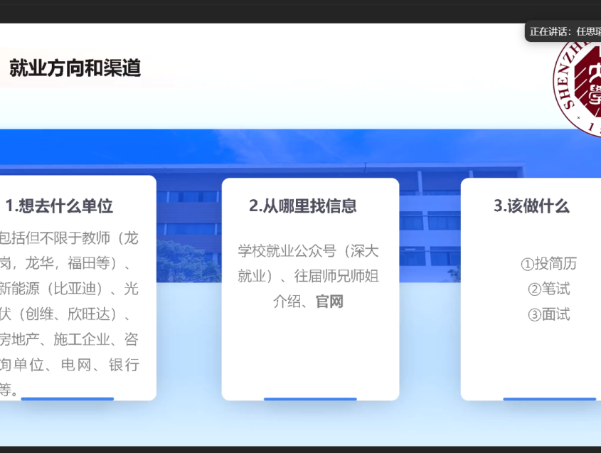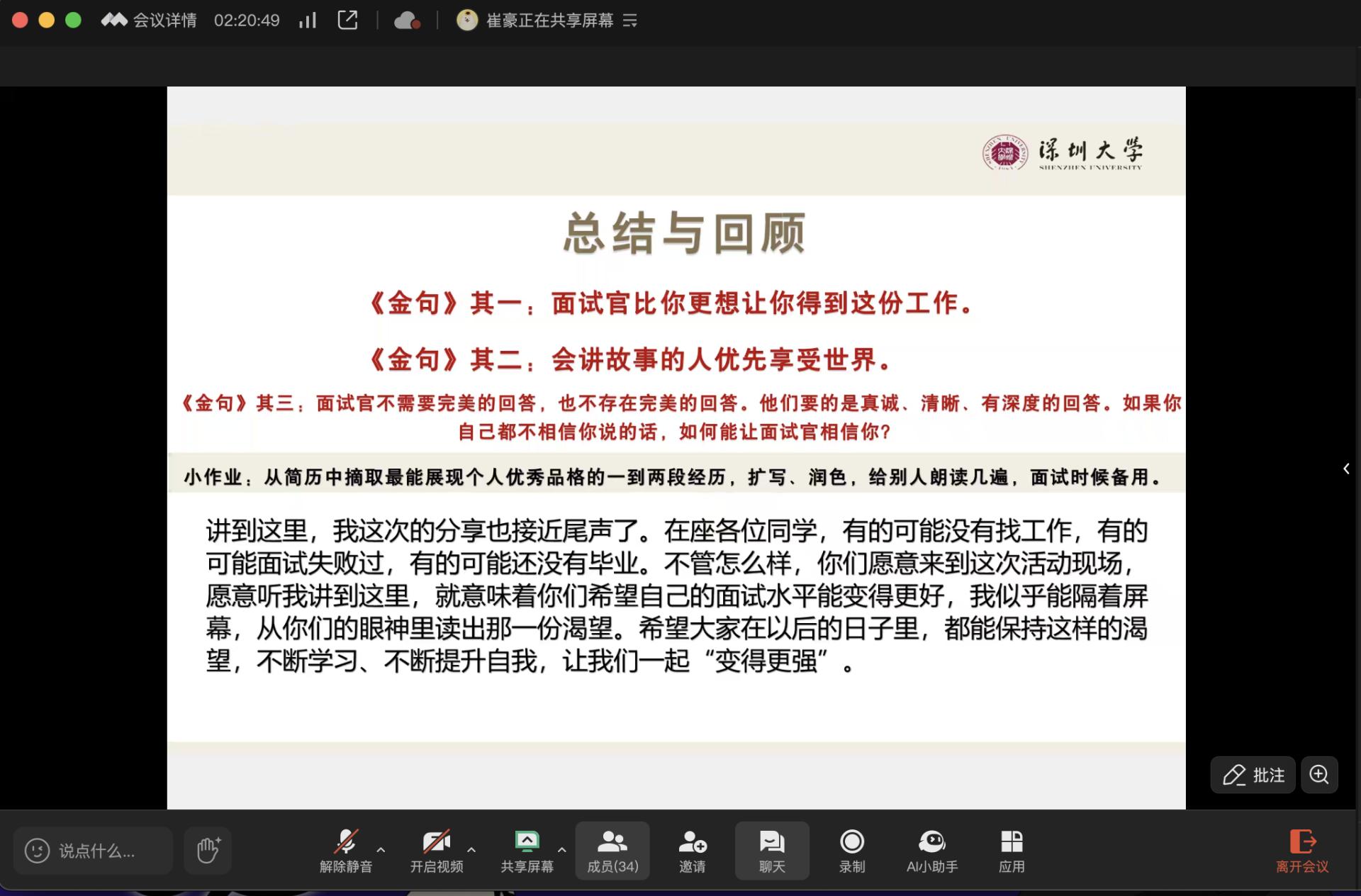 崔豪聚焦于企业求职。他说面试前应了解目标公司的发展历程、行业前景和岗位工作内容,不要随意投简历。面试心态方面,他总结了四个金句分享给大家,勉励同学们要调整好心态,接纳自己的不完美,明确职业目标。