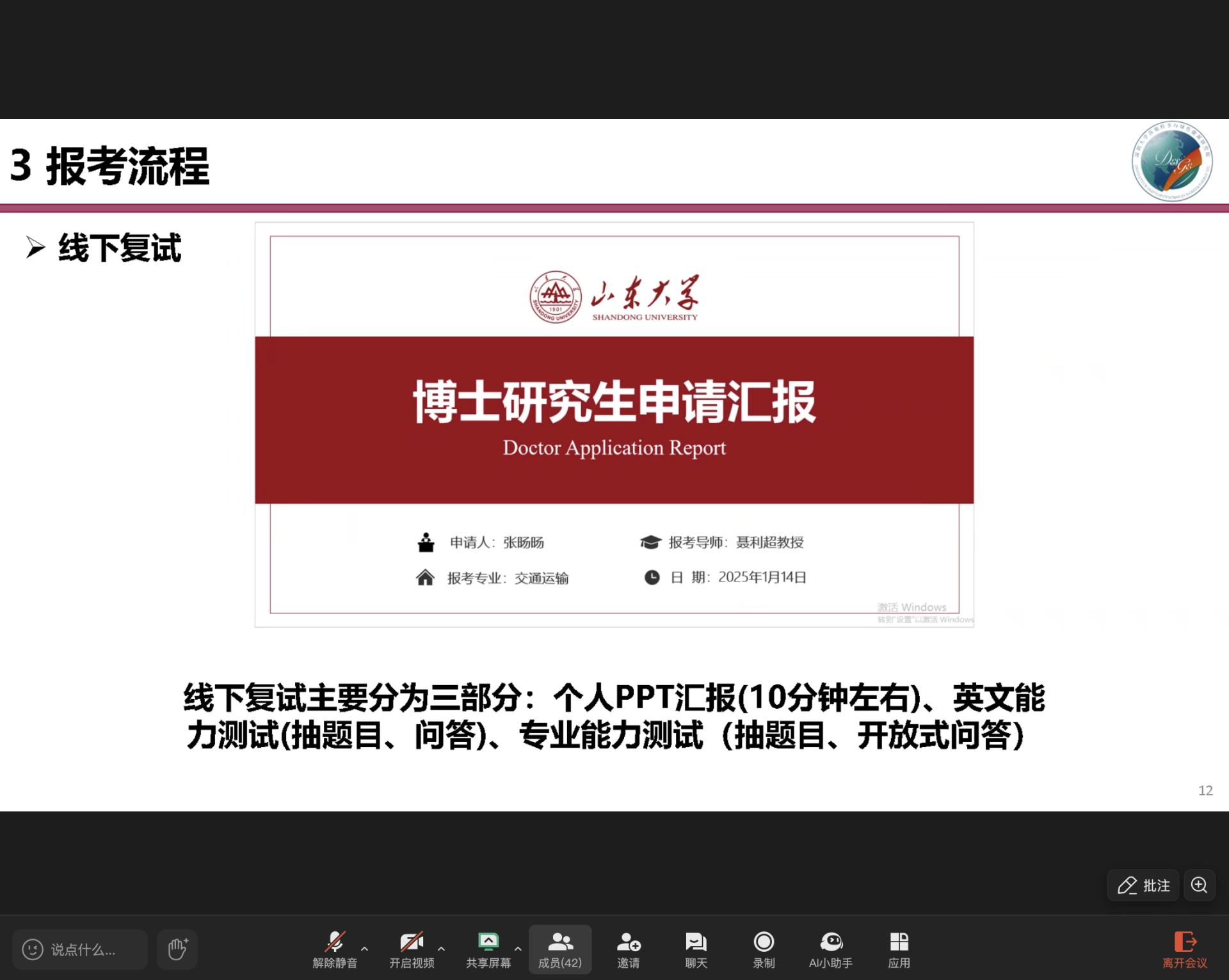 张旸旸首先介绍攻读博士的流程。他结合自身经验,从学术成果积累到复试细节把控,为有志深造的学子提供了系统化指导。他特别强调材料打磨的重要性:个人陈述需聚焦科研潜力与学术规划,推荐信应聘请领域内权威专家撰写以增强说服力。
