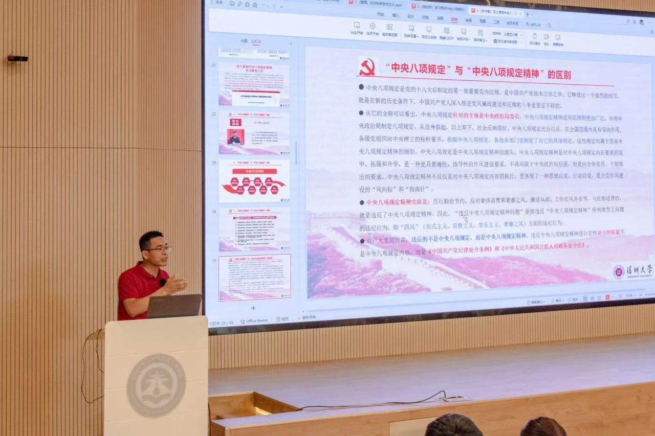 马克思主义学院副院长张守奎教授作了《深入贯彻中央八项规定精神 切实加强党的作风建设》专题讲座。张教授以发生在学习教育期间的多个典型案例为切入点,系统阐释了“中央八项规定”与“中央八项规定精神”的内涵与关联。张教授通过剖析违规吃喝、公款宴请、公款旅游、违反会议规定等突出问题,详细解读了违规行为的纪法界定与处分依据,并针对政策执行中的"一刀切"现象作了深入分析。讲座深刻揭示了违反中央八项规定精神的严重危害,并从制度建设、监督执纪、思想教育等方面提出了指导意见。