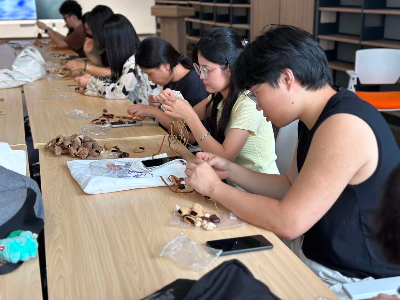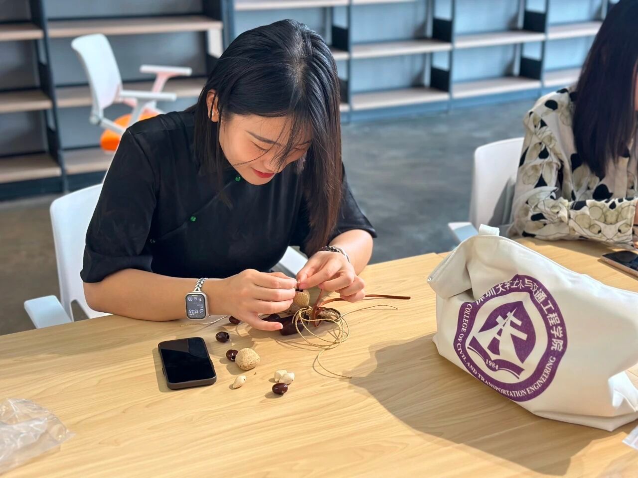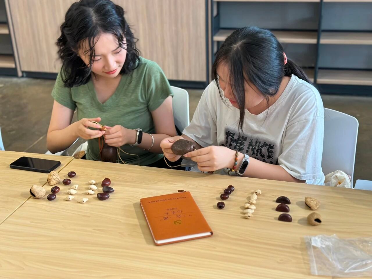 在轻松愉快的氛围中,活动进入核心环节——果壳摇铃手工制作与声音疗愈体验。支部为每位参与者准备了精心搭配的材料包,同学们纷纷动手,专注于手中的果壳、铃铛等小部件,通过巧手制作出一个个独具个性的果壳摇铃。大家轻轻摇动自己亲手制作的摇铃,霎时间淅淅索索的雨声、潺潺淙淙的流水声在友邻空间回荡,模拟出宁静自然的听觉场景。这种源于古老智慧与现代声学原理结合的“声音疗愈”,通过特定的音频频率与节奏,有效帮助参与者降低皮质醇水平,激活副交感神经,引导大脑进入放松的α波状态。