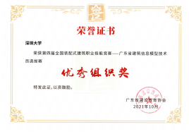 在我校土木与交通工程学院廖龙辉老师的指导下,深圳大学代表队(每个方向各1队,每队3名成员),从广东省30多支队伍、103名学生中脱颖而出,在BIM项目管理方向获得个人一等奖1项(全省第一名)、三等奖1项以及团体第三名,在BIM深化设计方向获得个人三等奖1项以及团体优胜奖,在BIM投标应用方向获得个人三等奖2项以及团队优胜奖,我校获得优秀组织奖,廖龙辉老师获得优秀指导老师奖。其中,钟泽贤同学将代表我校参加全国总决赛。