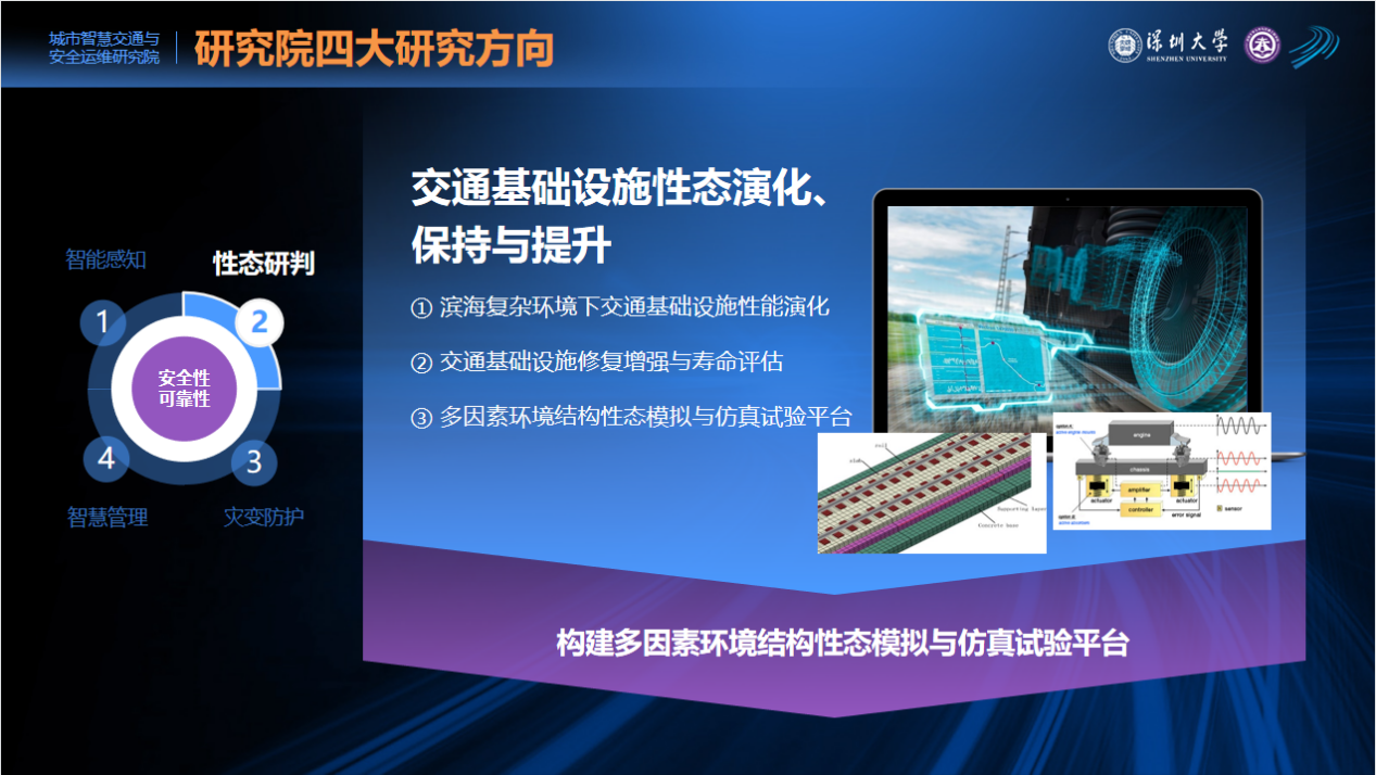 深圳大学城市智慧交通与安全运维研究院是依托于深圳大学土木与交通工程学院的一个相对独立的科研机构,并与中交一公院、长沙理工大学于2023年2月获批共建“极端环境绿色长寿道路工程全国重点实验室”。深圳大学讲席教授任伟新教授担任城市智慧交通与安全运维研究院院长,中国工程院杜彦良院士担任城市智慧交通与安全运维研究院首席专家,目前有科研人员30名,包括中国工程院院士、俄罗斯工程院外籍院士等国家级人才3人、教授5名、副教授4名、助理教授5名、副研究员2名和博士后10人,还聘请了日本工程院院士、杰青等一大批国内外知名专家为研究院的客座教授。
