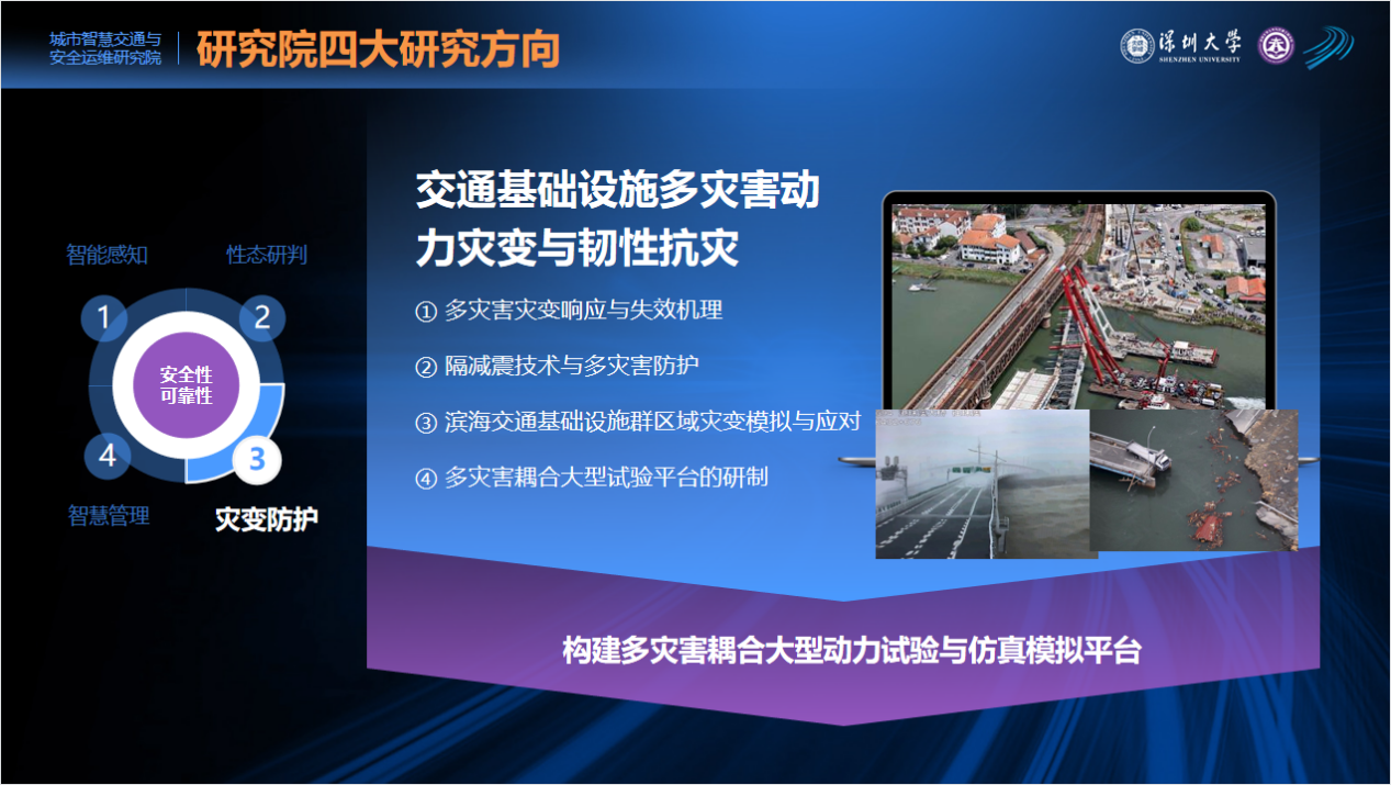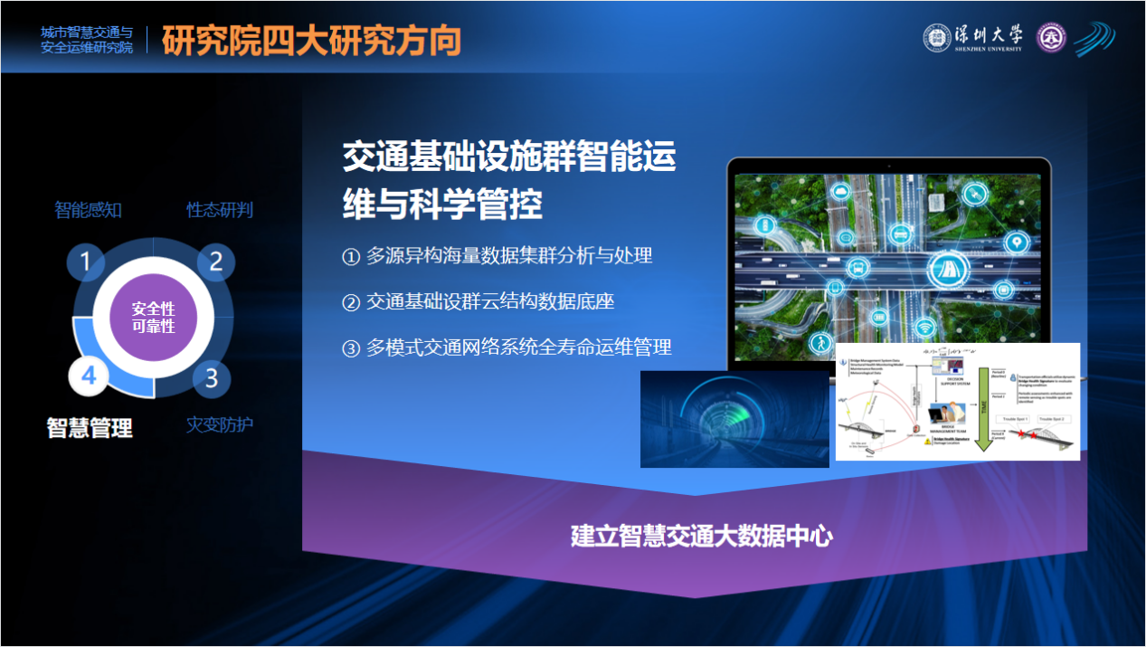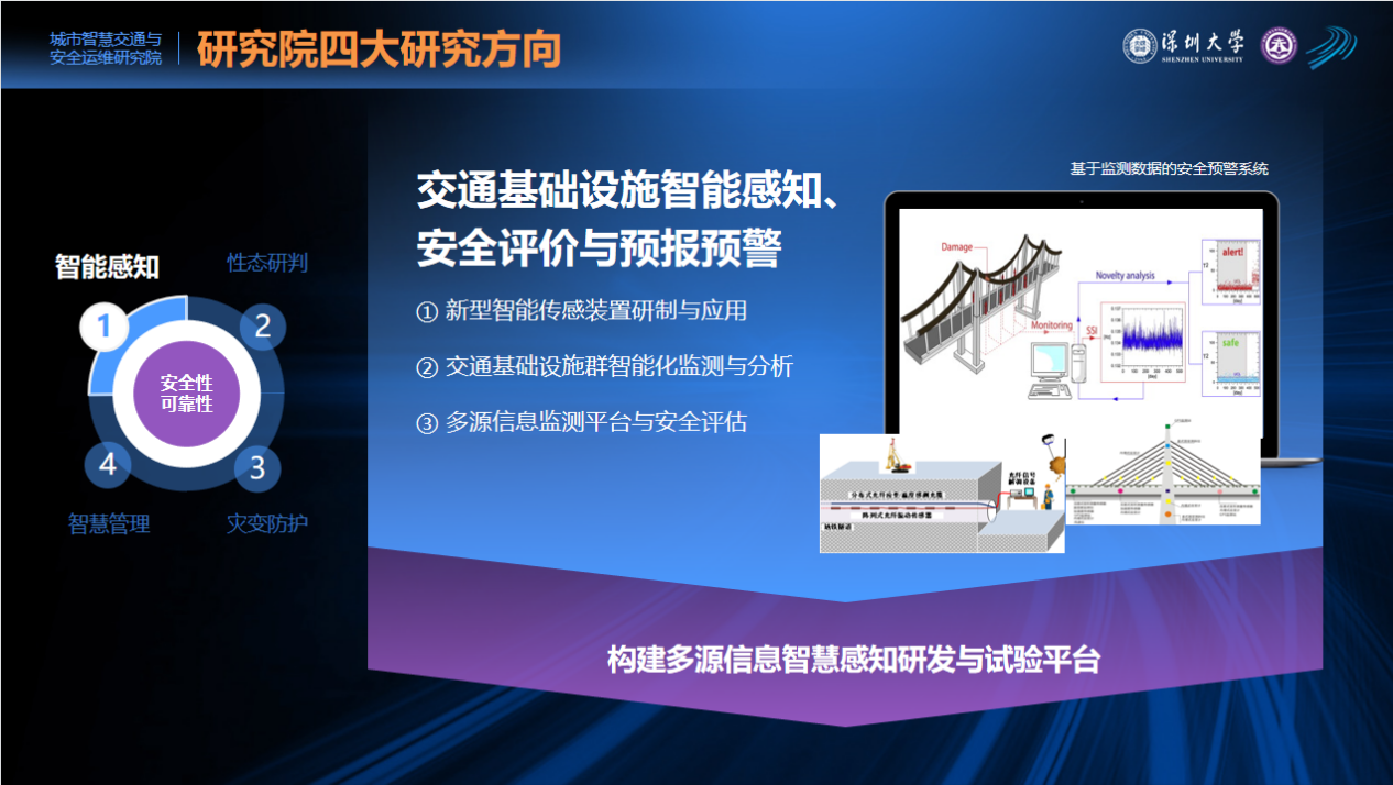 城市智慧交通与安全运维研究院以保证桥梁隧道、车站码头、高层建筑、交通枢纽、边坡道路、市政管道、港口堤坝、海底管道和海洋风电等重大基础设施的安全性和可靠性为目标,开展城市重要基础设施的感知监测、性态研判、灾变防护和智慧管理的科研和教学工作。
