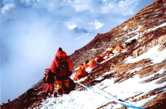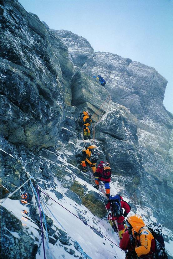 到珠峰8700米,就到了传说中的第二台阶,一段近乎直立的5米左右的大岩石立在通往山顶的唯一通途上,这里是通往顶峰的最后一道门,也是一道鬼门关。在那里是没有路的,队员们一个跟着一个走,如果后面的人想超过前面的,前面的人则需要整个人侧卧在冰面上,后面的队员慢慢跨过对方的身体。“在8000多米的高度,人的行动是很笨拙的,要超过一个人是很难的”,李老师就亲身体会过这其间的辛苦。