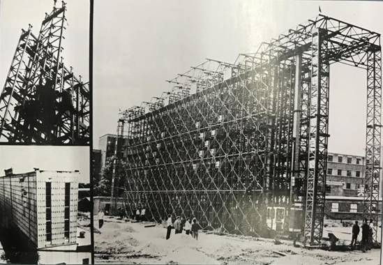 左上:货架结构正在吊装中;左下:立体仓库外貌;右:北京汽车制造厂自动化立体仓库货架结构主体