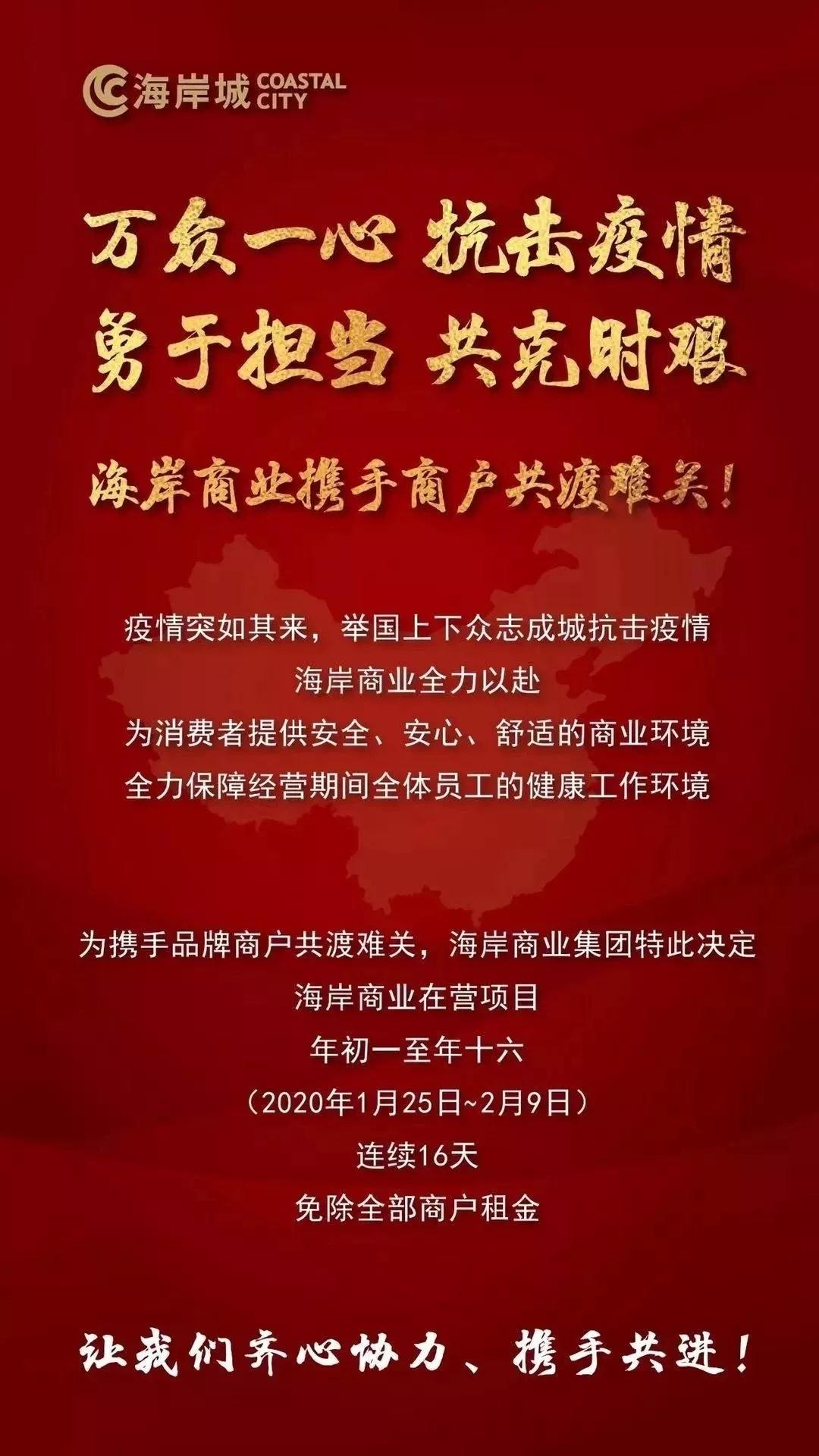 除了正中集团,海岸集团也用行动积极响应疫情期间免减租倡议,海岸商业在营项目免除了全部商户1月25日至2月9日连续16天的租金,携手商户共克时艰。