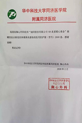 2月7日,DR集团全体员工为武汉同济医院捐赠医用防护服2600套,只愿尽此绵薄之力,守护前线那群最可爱的人,让他们同样感受人间自有真情在。
