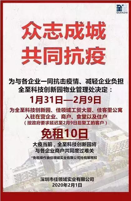 疫情当前,为减轻入驻企业负担,全至科技创新园在1月31日至2月9日免租10日,携手各企业商户一同抗击疫情。