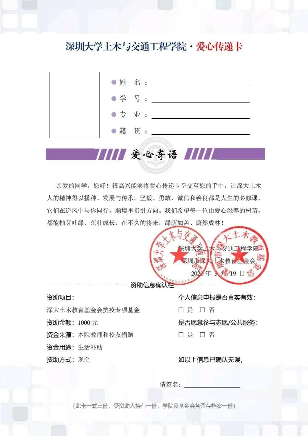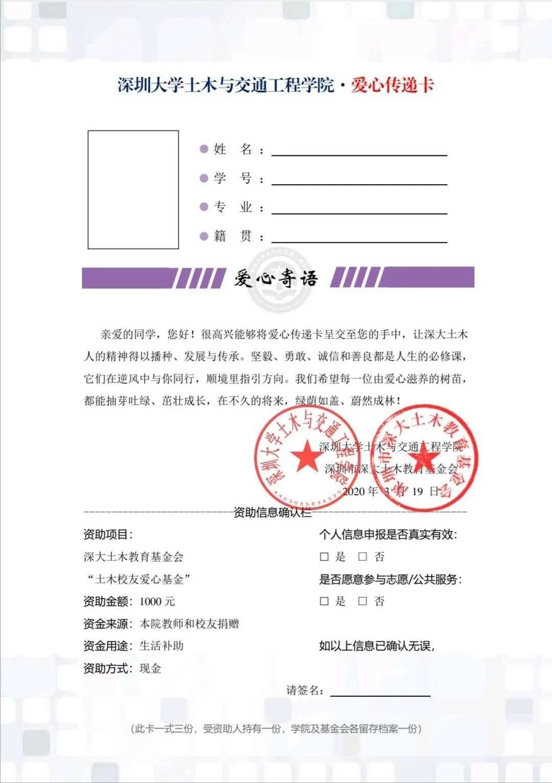 在此希冀每一位获资助的同学,都能将捐赠人的“爱心”传递下去,将深大土木人的精神带往更远的地方。获得资助的同学请填写爱心传递卡,用心守护承诺,在未来的日子里以实际行动积极参与志愿或公共服务,奉献自己的爱心。