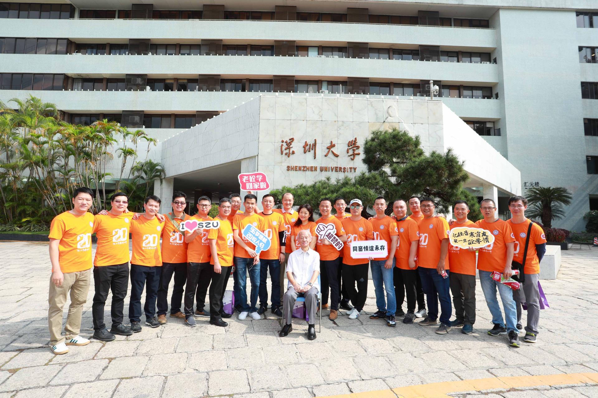 签到完换完服装后,大家围成一圈,互相寒暄,共叙旧情;不一会儿,张中权老师前来,同学们一个个上前与老师握手,向老师问好,与老师回忆那些年发生的事。等人聚齐后,大家分别在“深圳大学”和“脚踏实地”前合影。