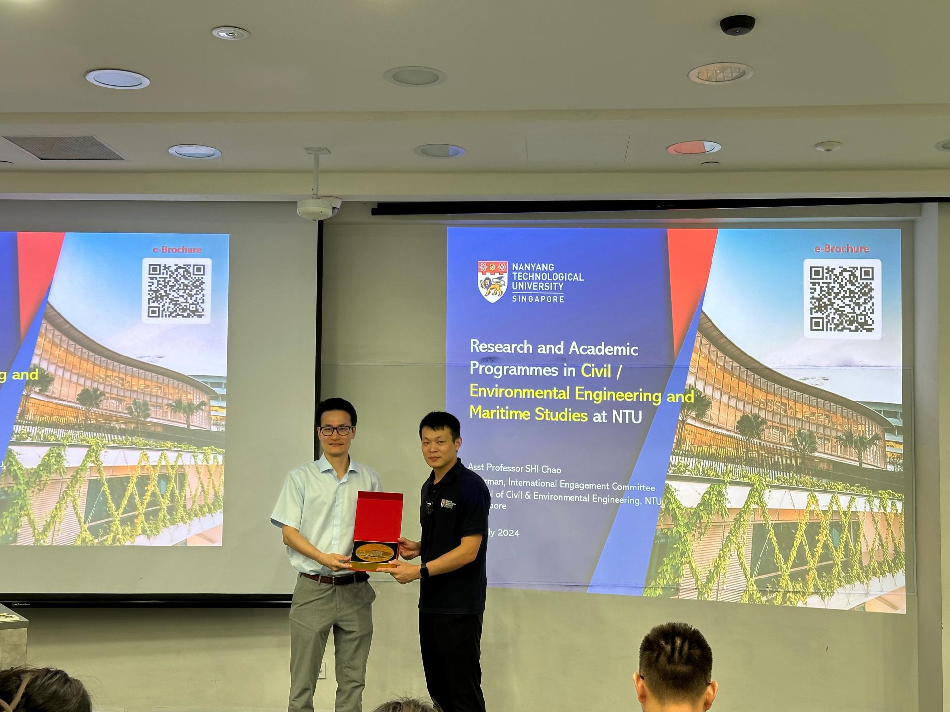 黄振宇老师代表学院将深圳大学校牌纪念品赠与南洋理工大学土木与环境工程学院。