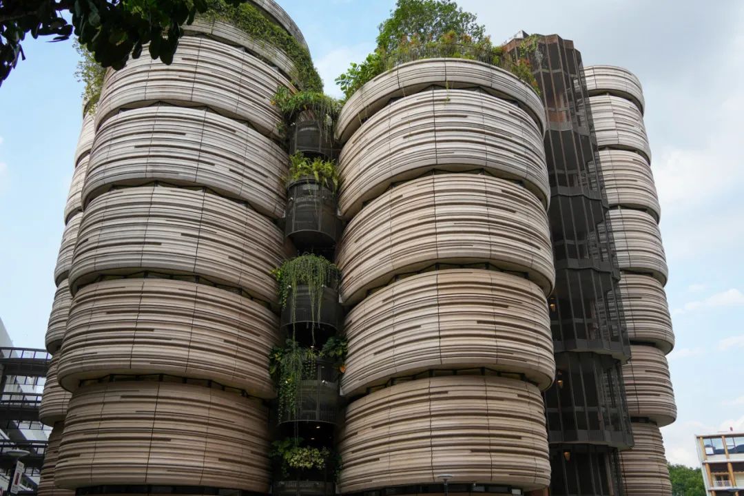"小笼包"采用天然通风的设计,由于对流效应,在室外也非常凉爽。这栋八层的建筑最底层是B5,1楼藏着一格小图书馆Library Outpost,馆内收藏了丰富的音频与影视资料。