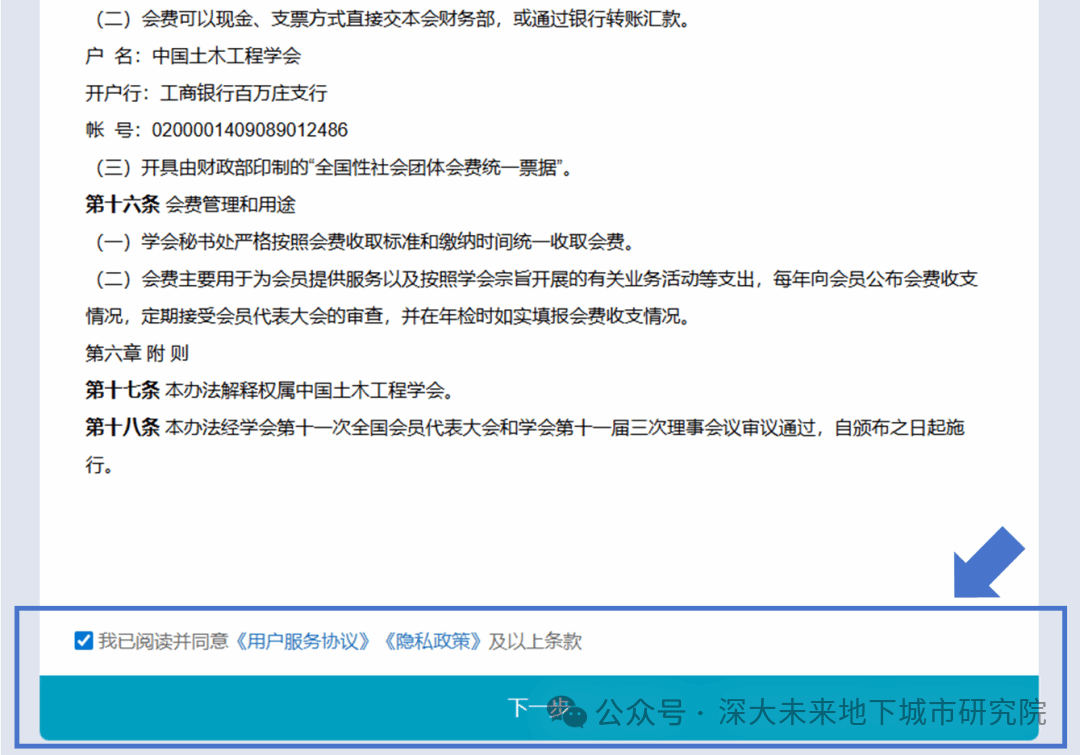 3、阅读学会会员与会费管理办法,其中会费标准为单位会员4000元/年、普通个人会员200元/年、学生会员不收取会费,阅读完毕后勾选同意选项,点击“下一步”,进入会员信息填写。