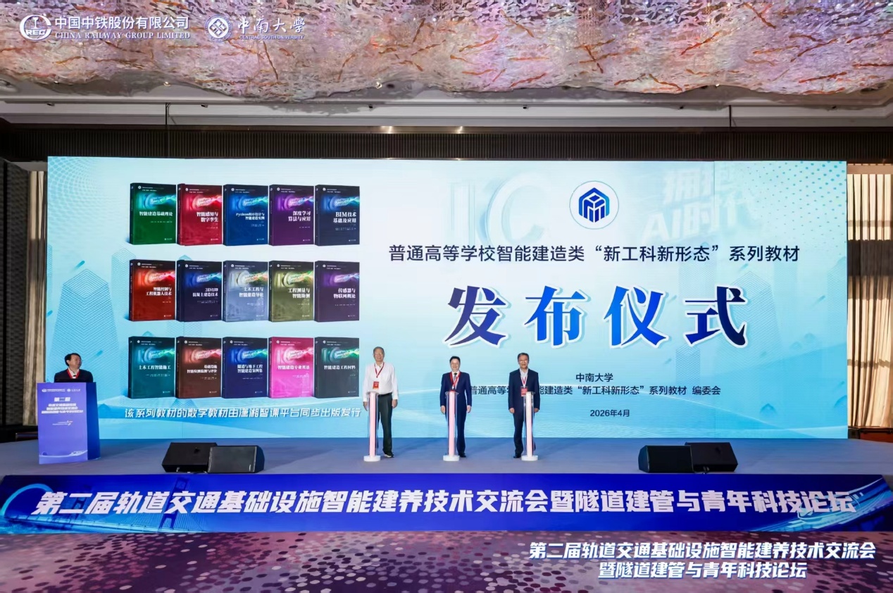 2026年4月23日,正值第31个“世界读书日”,由中国中铁股份有限公司、中南大学主办的“第二届轨道交通基础设施智能建养技术交流会暨隧道建管与青年科技论坛”在长沙举办。开幕式上,中南大学出版社出版的“普通高等学校智能建造类‘新工科新形态’系列教材”正式发布。