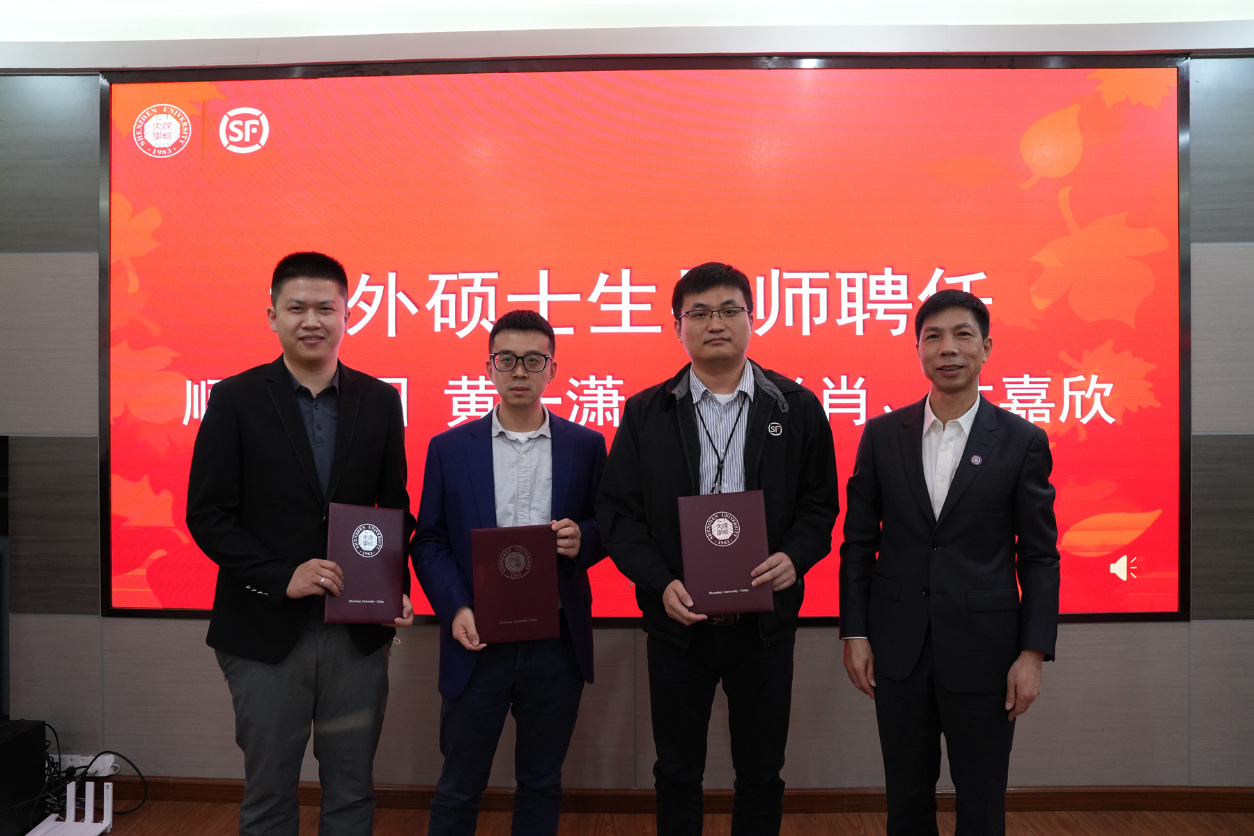 随后举行校外导师聘任环节,徐晨副校长向顺丰集团侯继娜副总裁颁发了校外博士生导师聘书。李伟文书记向顺丰集团运营模式算法总监黄一潇、场地规划总监孙肖肖、高级算法产品经理林嘉欣颁发了校外硕士生导师聘书。