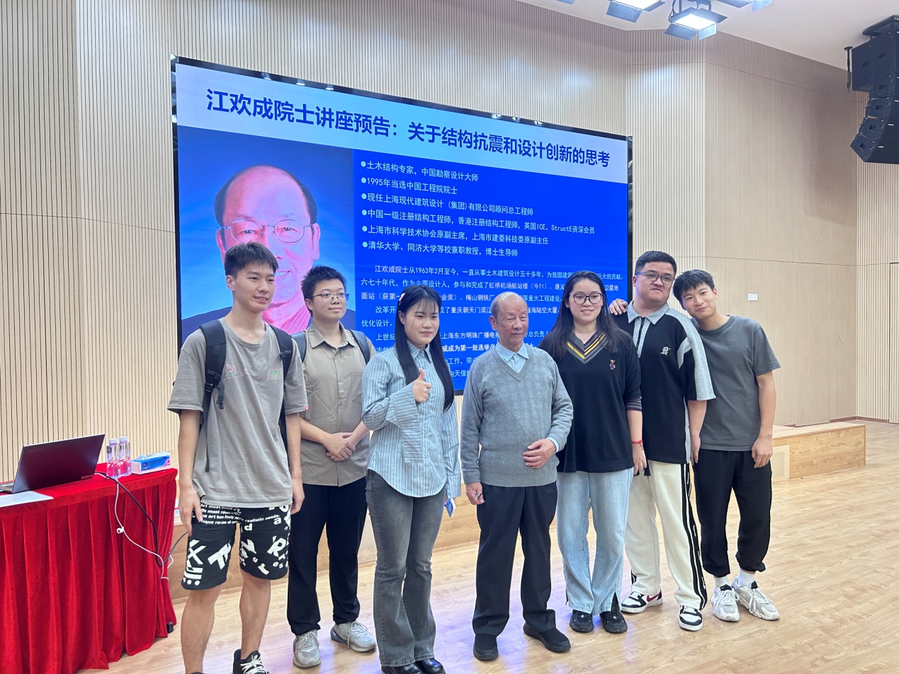 2023年11月30日下午16:30-18:00,在我院陈湘生院士院长的邀请下,中国工程院院士、上海东方明珠总设计师江欢成院士在深圳大学土木与交通工程学院致工楼A431报告厅主讲了题为“关于结构抗震和设计创新的思考”的专题讲座,在场共200多名学生和老师认真聆听了讲座,为深大土木学子打开创新发展的科学大门。